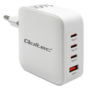 Qoltec 140W GaN Wall Charger | 5-20V | 2.5-5A | 3 x USB-C PD | 1 x USB QC 3.0 | White