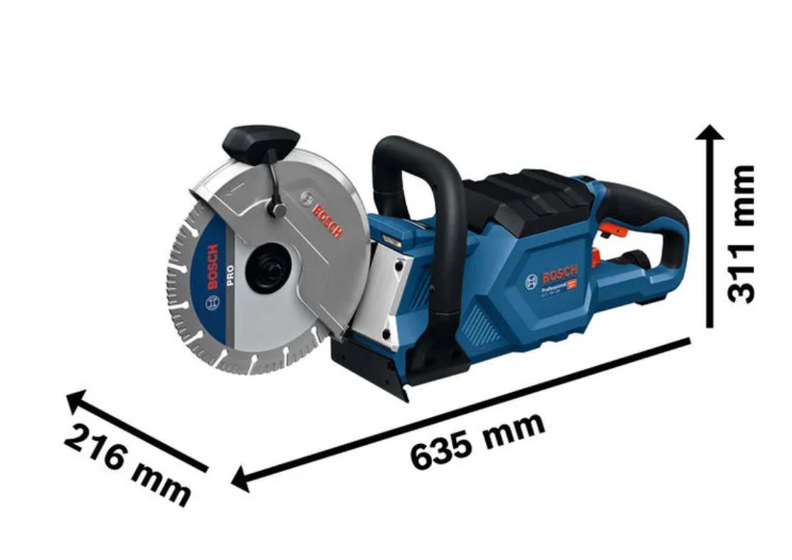 osch GCS 18V-230 pila za rezanje omogučuje je za brzo i učinkovito rezanje metala ili betona zahvaljujući snažnom motoru bez četkica C1000. S dostupnom patentiranom ručicom blokade vretena ploča se jednostavno zamjenjuje u rekordno vrijeme. Praktična funkcija kočenja ove pile za rezanje pomaže pri zaštiti tako da brzo prekida rotaciju rezne ploče čim se otpusti okidač. A zatvoreni odjeljak za akumulator pomaže pri zaštiti akumulatora od prašine, prljavštine i vlage. Pila za rezanje GCS 18V-230 također ima sustav za uklanjanje akumulatora s oprugom koji olakšava uklanjanje većih akumulatora od 18 V kada ih je potrebno napuniti, ili kad treba zamijeniti ploče Pila za rezanje Bosch GCS 18V-230 namijenjena je velikim komercijalnim podizvođačima, izvođačima radova betoniranja i rušenja, kao i majstorima koji rade u zidarstvu ili s kamenim fasadama. Služi za rezanje metala, uključujući armature, cijevi, metalne usadne vijke i metalne platforme. Omogućuje i mokro rezanje u betonu kod primjena kao što su uklanjanje betona radi rušenja, rezanje betonskih blokova te izvođenje radova s ciglom i popločavanje Bosch GCS 18V-230 ima oblu ručku za optimalnu uravnoteženost alata, 6 položaja za podešavanje štitnika, ergonomski okidač za uključivanje/isključivanje s ručicom za blokiranje, priključak adaptera za crijevo za brzo spajanje i ventil za zatvaranje vode za kontrolu dovoda vode za mokro rezanje betona. Također ima LED svjetiljku za osvjetljavanje radnog mjesta i indikator statusa akumulatora.