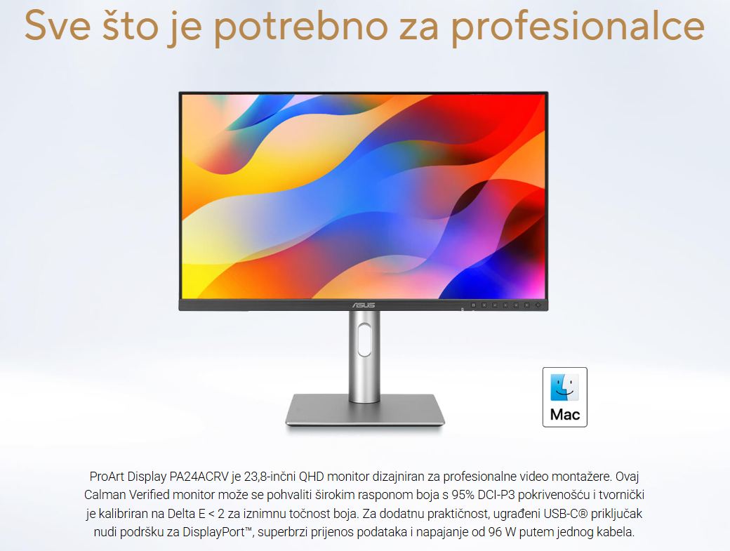 ASUS ProArt Display PA24ACRV profesionalni monitor – 24-inčni (23,8-inčni prikaz), IPS, QHD (2560 x 1440), 95% DCI-P3, točnost boja ΔE < 2, Calman Verified, USB-C PD 96W, VESA DisplayHDR 400, VESA MediaSync, ergonomsko postolje, zelena održivost