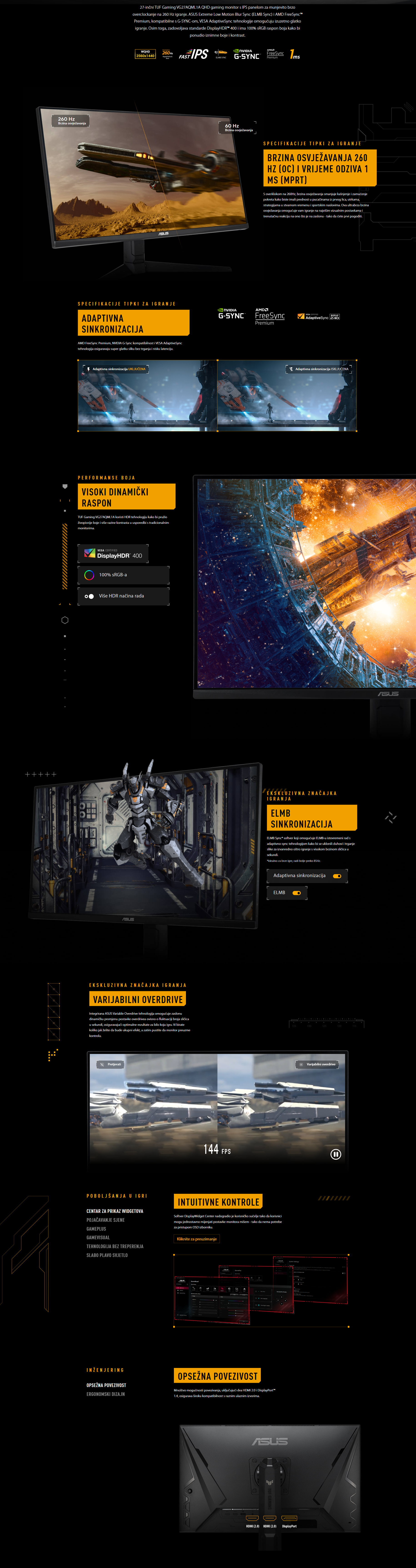 | Značajke | GameVisual Odabir temperature boja: Da (4 načina rada) GamePlus HDCP ELMB sinkronizacija VRR tehnologija: Da (Adaptive-Sync) Pojačavanje sjena DisplayWidget: Da, DisplayWidget Center Low Blue Light |