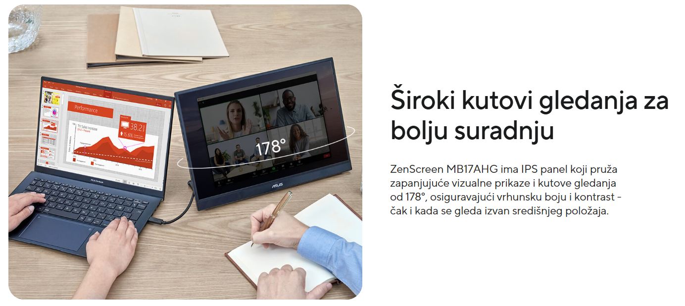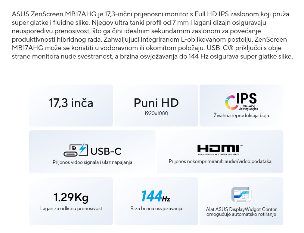 (17,3-inčni prikaz) FHD (1920 x 1080) IPS panel, 144 Hz, SmoothMotion tehnologija, L-oblikovani stalak, tronožac, USB Type-C®, HDMI®, Flicker Free, Low Blue Light, FSC