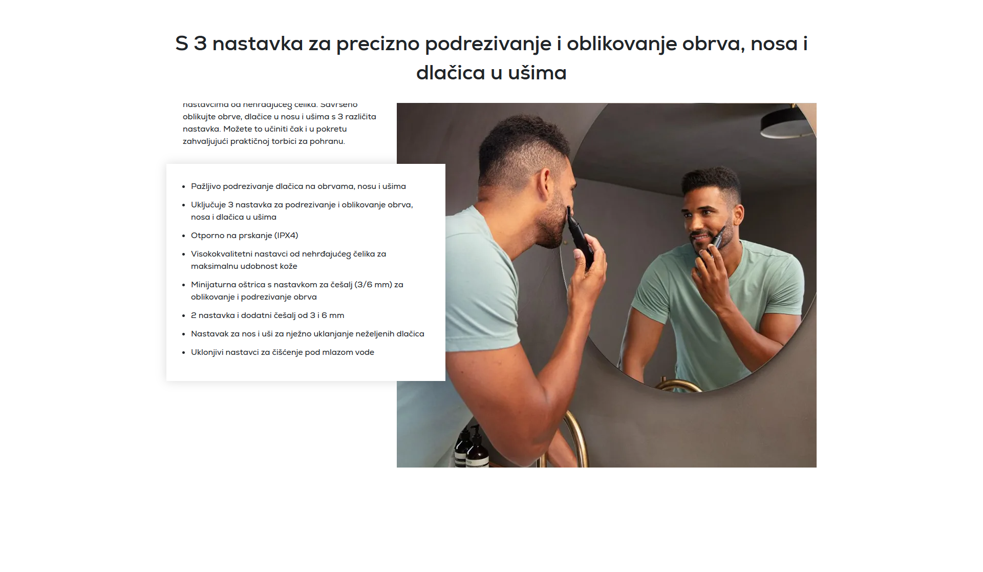 Opremljen s tri visokokvalitetna nastavka od nehrđajućeg čelika, omogućuje precizno oblikovanje obrva te uklanjanje neželjenih dlačica iz nosa i ušiju.