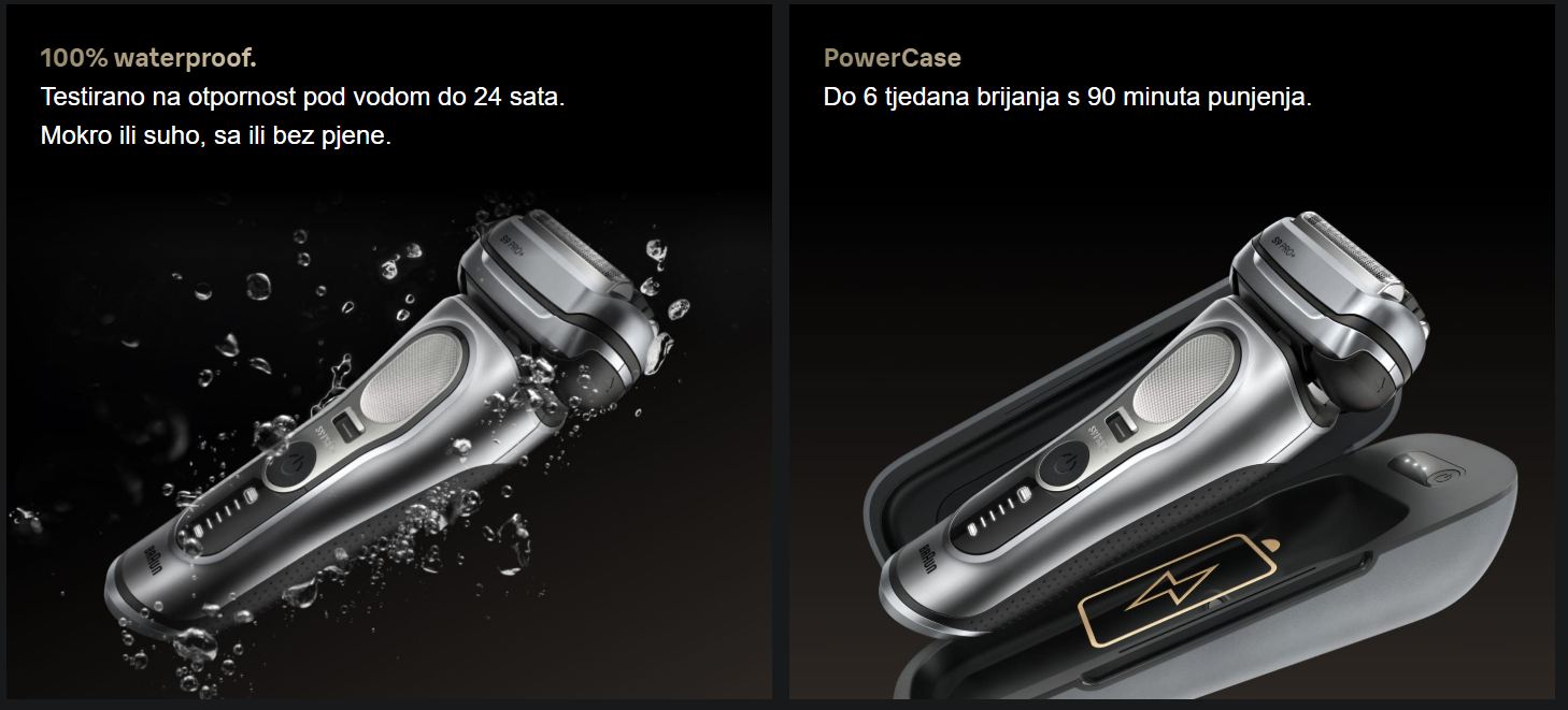 Brijač BraunSeries 9 je najučinkovitiji električni brijač na svijetu. Ovaj mrežasti brijačpruža temeljito i nježno brijanje bez kompromisa. Ovaj mrežasti brijač jeprikladan za mokro i suho brijanje. Sada možete brijati dugo bez kabla 60minuta. Baterija ima 20% više kapaciteta od prethodnog brijača serije 9. SadržiPro zaslon s prikazom performansi. 5 elemenata za brijanje jamče da u jednompotezu hvata više dlaka nego bilo koji drugi brijač. Specijalizirani središnjitrimer pokriva sve tipove kose, što seriju 9 čini najučinkovitijim brijačem nasvijetu.