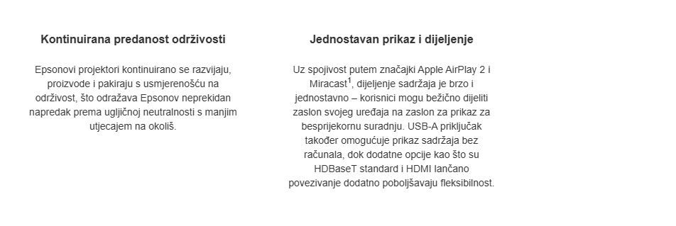 Povezivost | Priključci USB 2.0-A, USB 2.0 tipa B (samo usluga), RS-232C, Ethernet sučelje (100 Base-TX/10 Base-T), Bežični LAN IEEE 802.11a/b/g/n/ac, VGA ulaz (2x), VGA izlaz, HDMI ulaz, Kompozitni ulaz, Miracast, Izlazni priključak za utičnicu, Ulazni priključak za utičnicu, Činč audio ulaz, ulaz za mikrofon, Apple AirPlay 2 Mrežni protokol HTTPS, IPv6, SNMP |