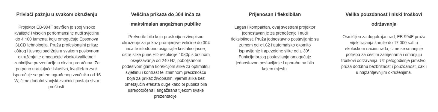 Ostalo | Power consumption 284 W (Normal On-Mode), 181 W (Eco On-Mode), 332 W (Normal Peak-mode), 231 W (Eco Peak-Mode), 0,3 W (Energy saving standby) Napon AC 100 V - 240 V, 50 Hz - 60 Hz Mjere proizvoda 309 x 293 x 105 mm (širina x dubina x visina) Masa proizvoda 3,1 kg Razina buke Normalno:37 dB (A) - Štedljivo:28 dB (A) TemperaturaSkladištenje -10° C - 60° C Vlažnost zrakaSkladištenje 10% - 90% Dodatne mogućnostiAir filter, Ceiling mount, Kamera za dokumente, Vanjski zvučnik, Safety wire set, Mekana torba za nošenje, Spare lamp, Suspension adapter Zvučnik 16 W |