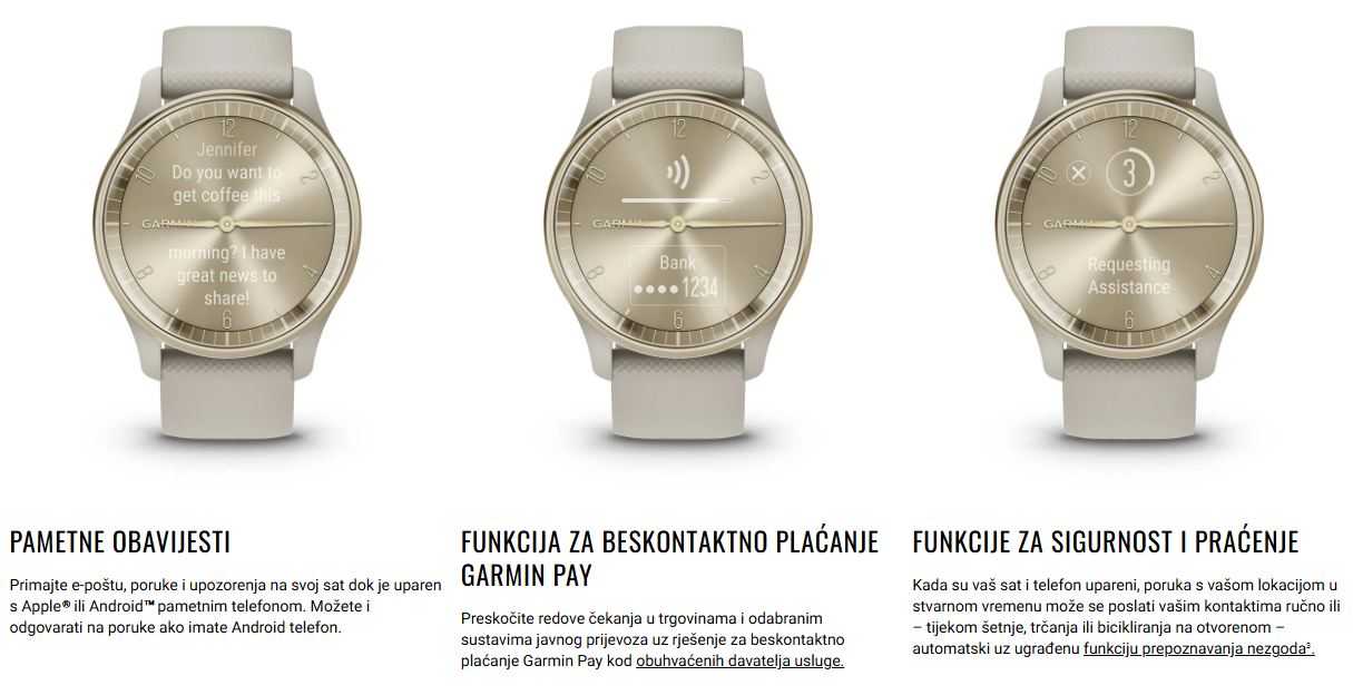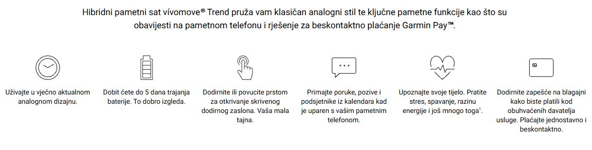 Hibridni pametni sat vívomove® Trend pruža vam klasičan analogni stil i bitne pametne značajke kao što su obavijesti pametnog telefona i beskontaktno plaćanje Garmin Pay™.