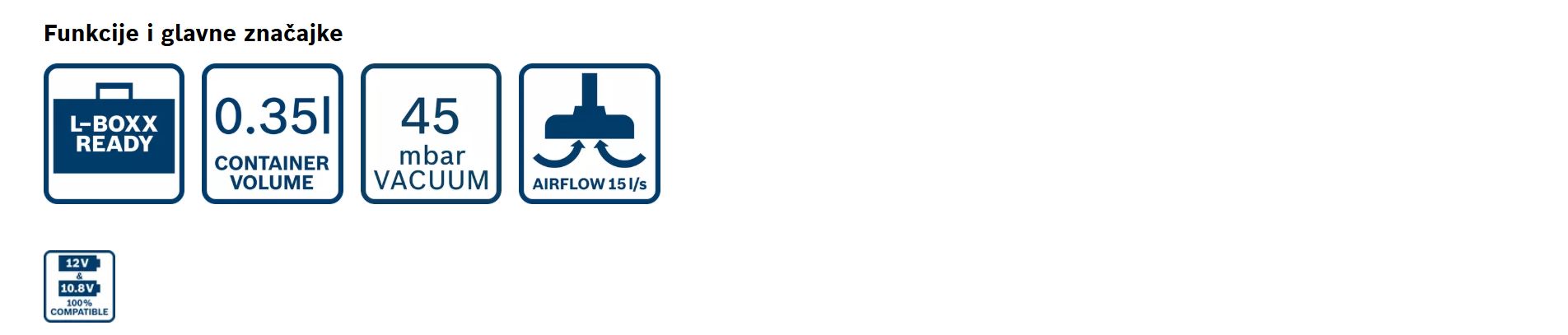 | Dodatni podaci | Napon baterije12,0 V Težina bez baterije0,7 kg Volumen spremnika0,35 l Područje filtra408 cm² Maks. brzina protoka zraka (turbina)15 l/s Maks. negativni tlak (turbina)45 mbara Dimenzije pakiranja (širina x duljina x visina)205 x 334 x 105 mm |
