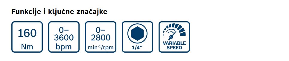 | Kapacitet akumulatora2 Ah Napon akumulatora18,0 V Zakretni moment, maks.160 Nm Broj okretaja u praznom hodu0 O/min Prihvat alata1/4'' univerzalni šesterostrani prihvat Zakretni moment, maks. (tvrdo uvrtanje)160 Nm Težina s akumulatorom1,4 kg Broj okretaja u praznom hodu (1. razina)0-2.800 min-1 Broj udaraca0-3.600 min-1 Težina bez akumulatora1,02 kg  | |