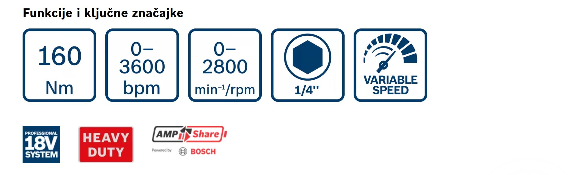 | Dodatni podaci | Napon akumulatora 18,0 V Zakretni moment, maks. 160 Nm Broj okretaja u praznom hodu 0-2.800 O/min Prihvat alata 1/4'' univerzalni šesterostrani prihvat Broj okretaja u praznom hodu (1. razina) 0-2.800 min-1 Broj okretaja u praznom hodu (2. razina) 0-1.800 min-1 Težina bez akumulatora 1,02 kg Broj udaraca 0-3.600 min-1 |