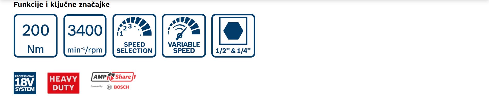 | Dodeatni podaci | Napon akumulatora18,0 V Zakretni moment, maks.200 Nm Broj okretaja u praznom hodu0-3.400 O/min Prihvat alata1/2" četverokut, 1/4'' univerzalni šesterostrani prihvat Broj okretaja u praznom hodu (1. razina)0-1.100 min-1 Broj okretaja u praznom hodu (2. razina)0-2.300 min-1 Broj okretaja u praznom hodu (3. razina)0-3.400 min-1 Stupnjevi zakretnog momenta3 Težina bez akumulatora1,2 kg Broj udaraca0-4.000 min-1 Broj udaraca (1. razina)0-2.300 min-1 Broj udaraca (2. razina)0-3.400 min-1 Broj udaraca (3. razine)0-4.000 min-1  |