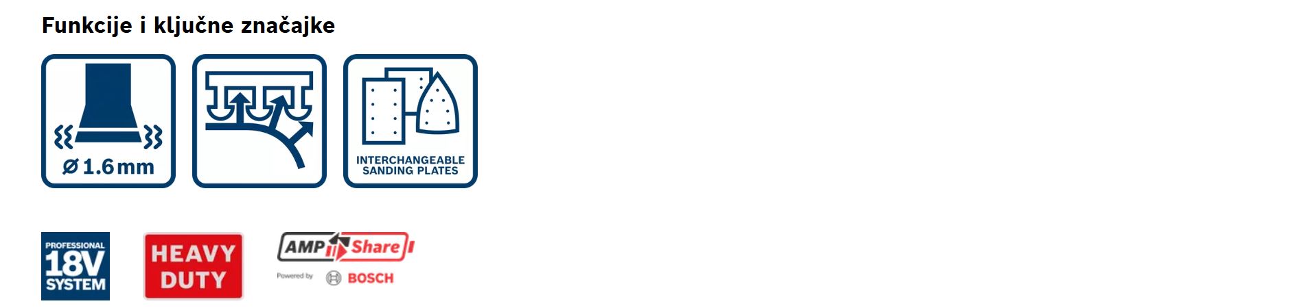 | Osnovni podaci | Napon akumulatora18,0 V Promjer oscilacijskog kruga 1,6 mm Težina s akumulatorom 1,7 kg Broj oscilacija u praznom hodu 22.000 min-1 Brusna ploča Delta s čičkom, dužina 150 mm Brusna ploča Delta s čičkom, širina 100 mm Brusna ploča s čičkom, dužina 130 mm Brusna ploča s čičkom, širina 80 mm Brusna ploča s čičkom i stegom, dužina 101 mm Brusna ploča s čičkom i stegom, širina 113 mm  |