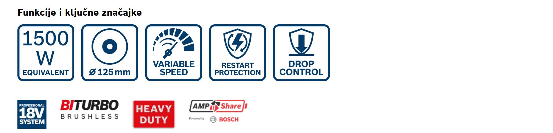 | Dodatni podaci | Napon akumulatora 18,0 V Broj okretaja u praznom hodu 3.400 – 9.800 min-1 Promjer ploče 125 mm Težina s akumulatorom 3,2 kg Navoj brusnog vretena M14 Provrt, promjer 22,23 mm Težina bez akumulatora 2,3 kg  |