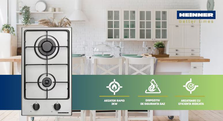 HEINNER HBH-V302EIX je kompaktna ugradbena plinska ploča s dva plamenika,te je idealna je za manje kuhinje