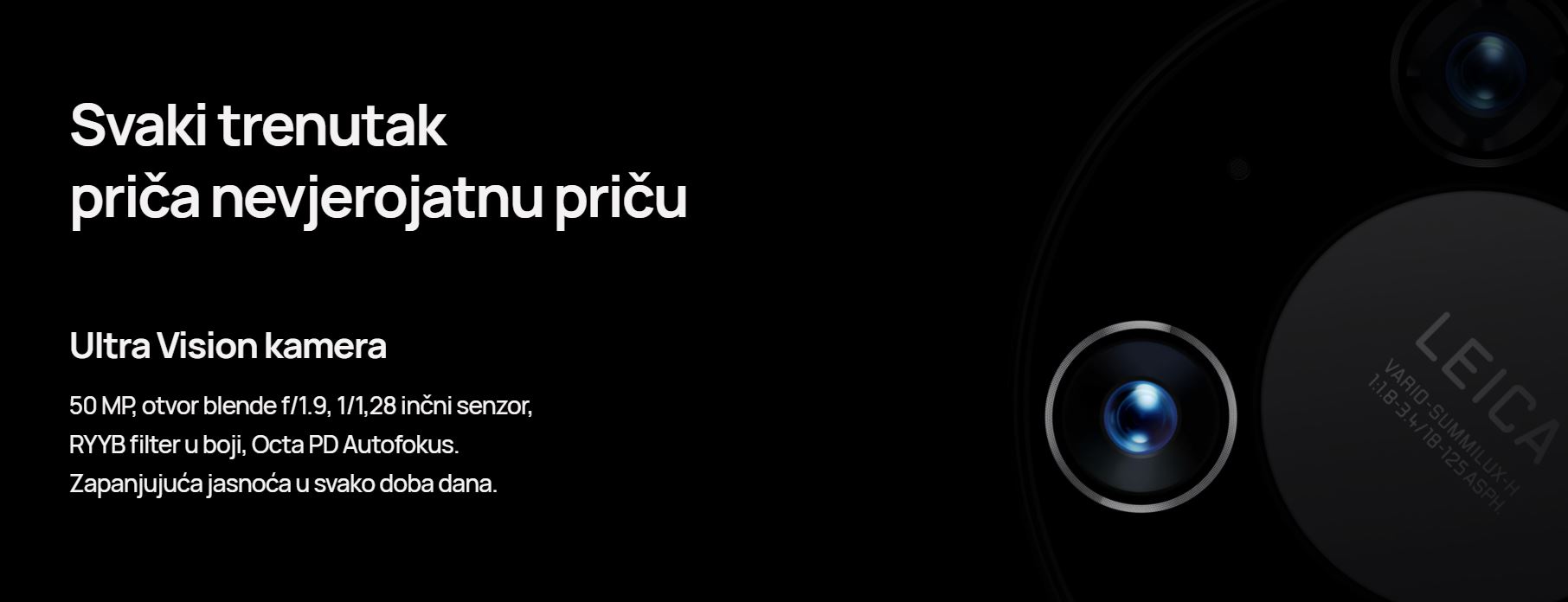 | Kamera | 50 MP, f/1.9, 23 mm (široko), 1/1.28", 1.22 µm, višesmjerni PDAF, Laser AF 12 MP, f/3.4, 125 mm (periskop telefoto), PDAF, OIS, 5x optički zoom 20 MP, f/1.8, 18 mm (ultrawide), PDAF Leica optika, LED bljeskalica, panorama, HDR Video 4K@30/60fps, 1080p@30/60/120/240/480fps, 720p@960fps, 720p@3840fps, HDR, gyro-EIS |