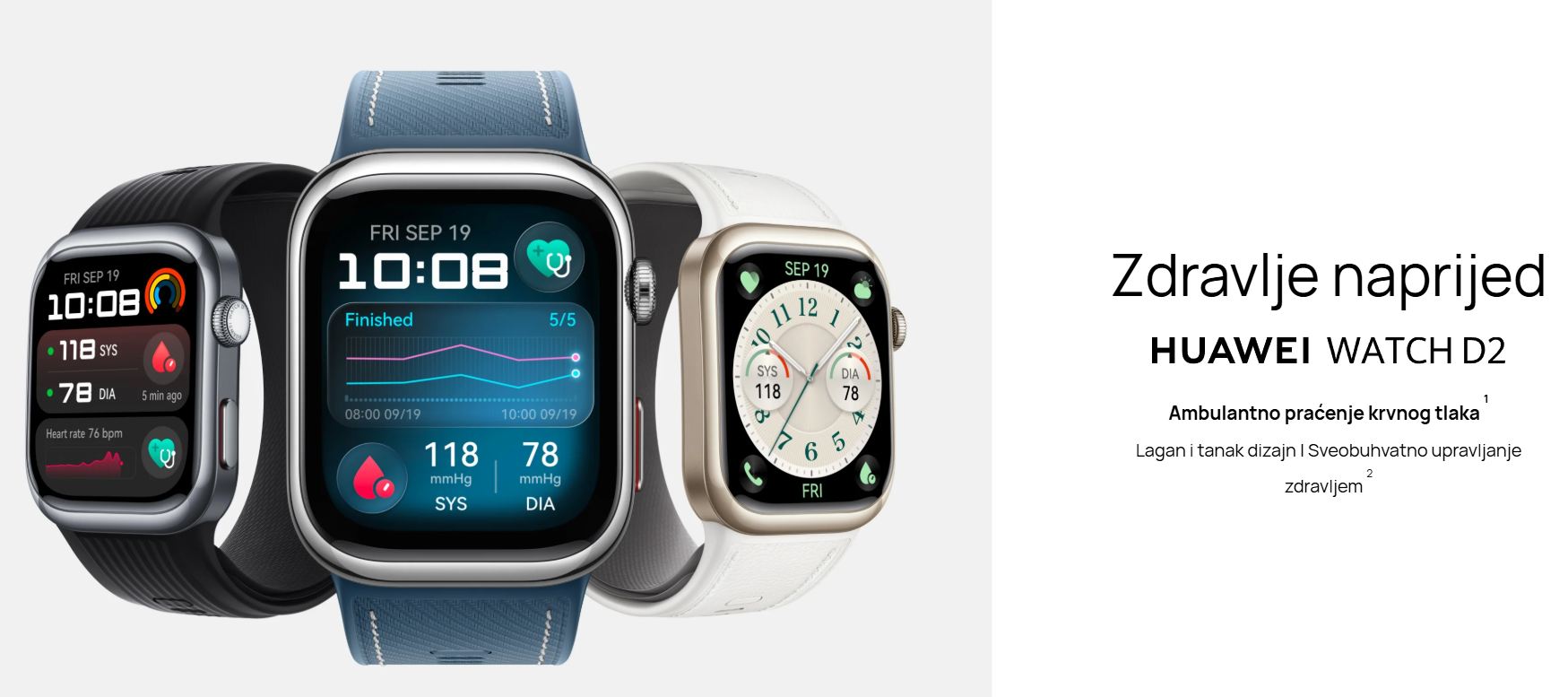 Huawei D2 pametni sat visokih performansi ima više od 80 sportskih modova i nudi detaljnu analizu aktivnosti. Sat sadrži precizne senzore, prikazuje obavijesti i podržava pozivanje putem Bluetootha i glasovnog asistenta s mikrofonom i zvučnikom.