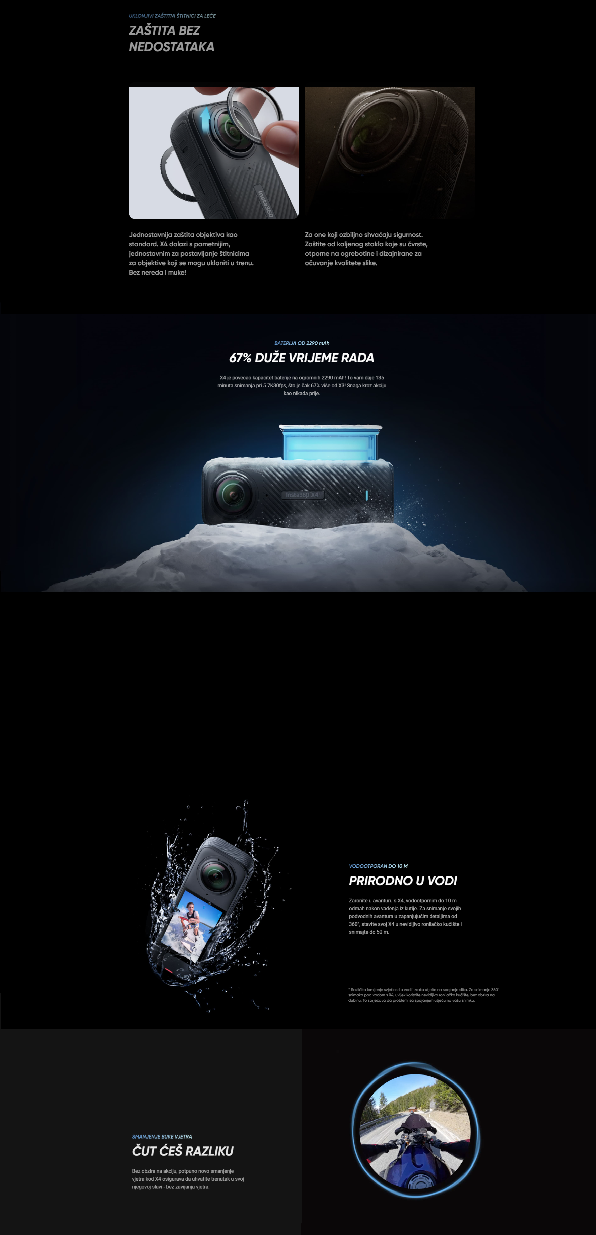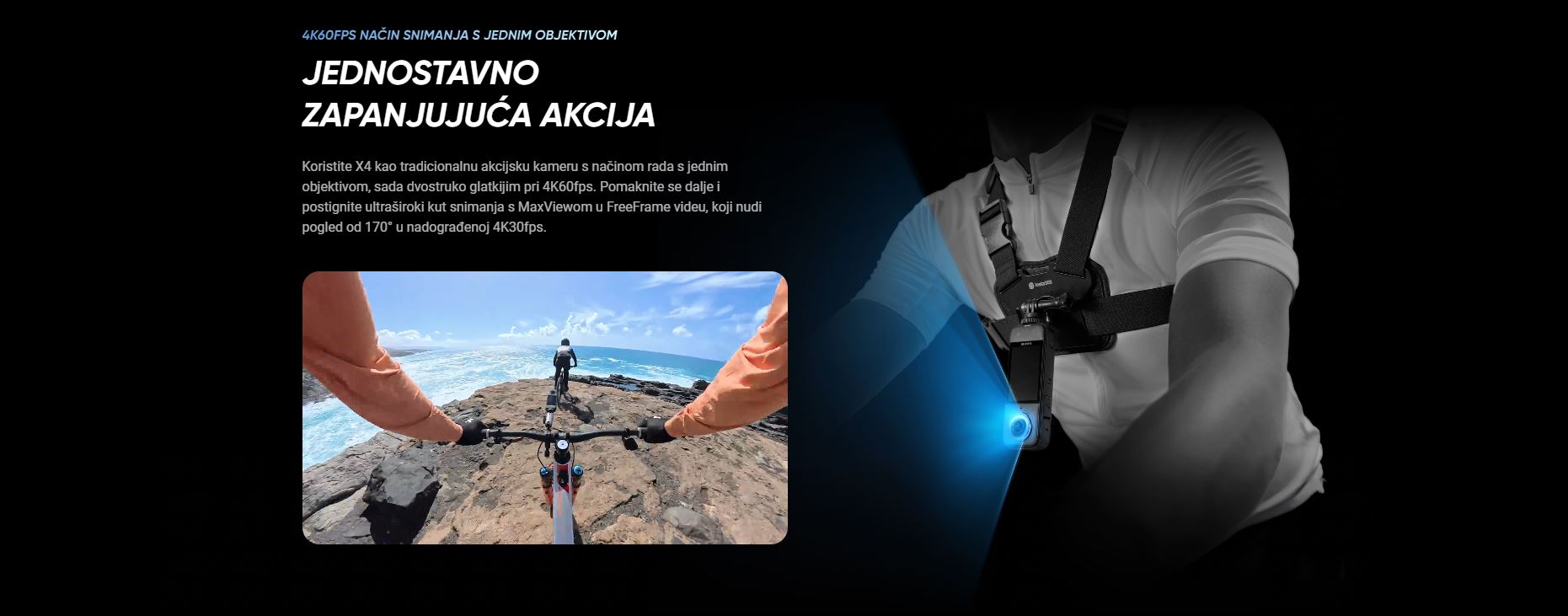 5.7K60FPS 360° VIDEO - Veći broj sličica u sekundi, veća kvaliteta. Doživite glatkije i oštrije slike za svaki kadar s poboljšanih 60 sličica u sekundi. Idealno za akcijske sportove ili scene s puno pokreta. Za kinematografski usporeni snimak smanjite na 4K100fps.