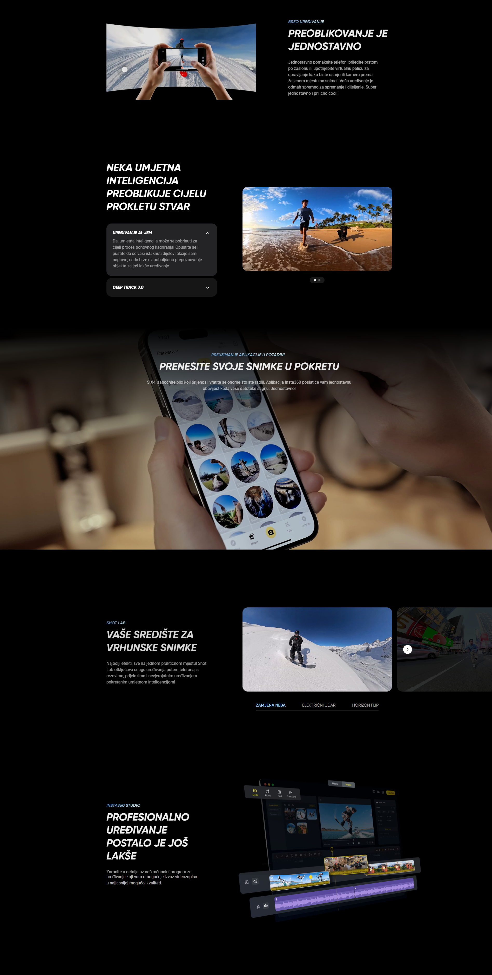 PREKADRIRANJE - Prvo snimaj, kadriraj kasnije.Čarolija snimanja od 360º je odabir najboljih kutova nakon snimanja. Uz alate za prekadriranje pokretane umjetnom inteligencijom u aplikaciji Insta360, samo pritisnite snimaj i pronađite savršenu snimku nakon toga.