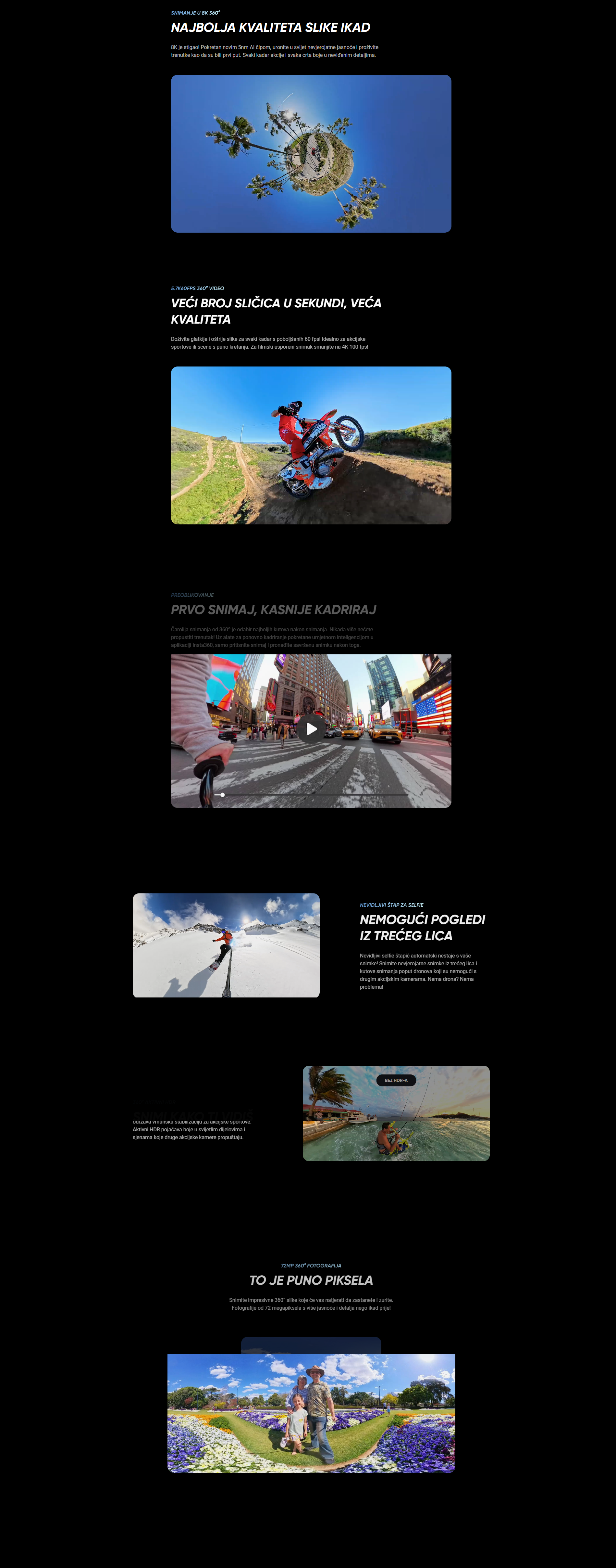 | Razlučivost videa | 360º način rada: 8K: 7680x3840@30/25/24fps 5,7K+: 5760x2880@30/25/24fps 5,7K: 5760x2880@60/50/30/25/24fps 4K: 3840x1920@100/60/50/30/25/24fps Način rada s jednim objektivom: 4K: 3840x2160@60/50/30/25/24fps 2,7K: 2720x1536@60/50/30/25/24fps 1080p: 1920x1080@60/50/30/25/24fps Način rada za mene: 4K: 3840x2160@30/25/24 sličice u sekundi 2.7K: 2720x1536@120/100/60/50fps 1080p: 1920x1080@120/100/60/50fps  | |