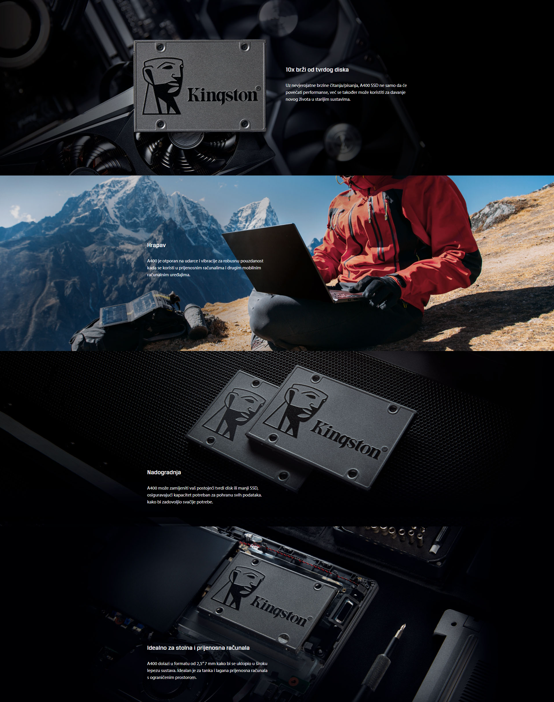 Njegova otpornost na udarce i vibracije te niža radna temperatura i razina buke čine ga idealnim izborom za prijenosna računala i druge mobilne uređaje. Ovaj A400 dolazi u kapacitetu do 480 GB, pružajući dovoljno prostora za vaše aplikacije, videozapise, fotografije i druge važne datoteke.