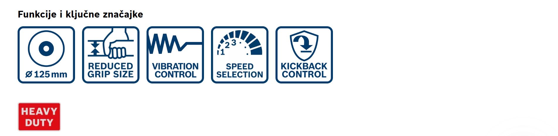 | Dodatni podaci | Nazivna ulazna snaga 1700 W  Broj okretaja u praznom hodu 2.800 – 11.500 min-1 Promjer ploče 125 mm Napon, električni 230 V Glavna ručka Rukohvat Težina 2,2 kg Prekidač Prekidač s mogućnošću zabravljenja  |