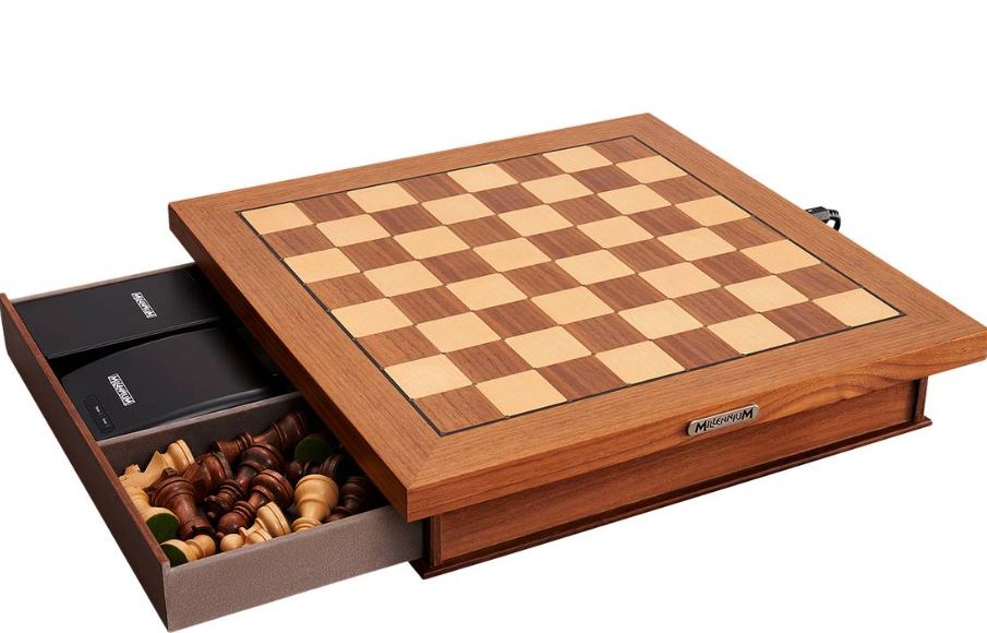 S luksuznom e-pločom možete igrati na pravoj šahovskoj ploči koristeći šahovske aplikacije ili online na Lichessu. Pribor i kabeli jednostavno nestaju u elegantnom drvenom stalku.