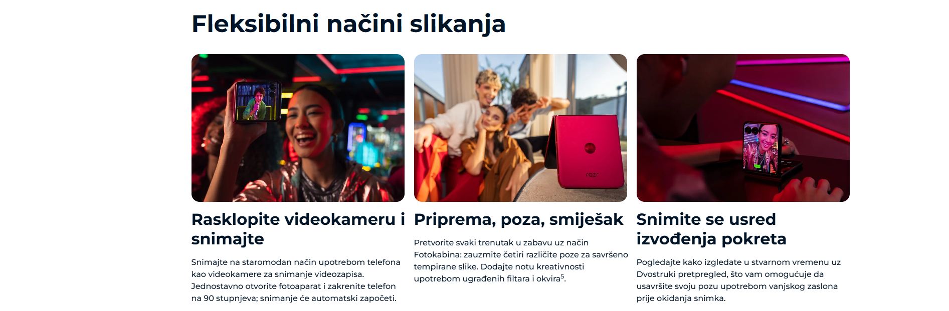 Motorola Razr 50 Ultra opremljen je naprednim kamerama za oštre fotografije i videozapise, a AMOLED ekran donosi živopisne boje i izvanrednu jasnoću.