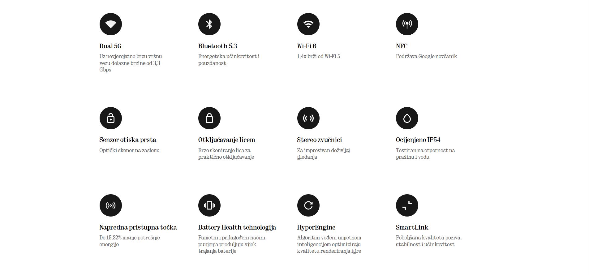 | Povezivanje | Wi-Fi 802.11 a/b/g/n/ac/6, dvopojasni, Wi-Fi Direct Bluetooth 5.3, A2DP, LE Pozicioniranje GPS, GALILEO, GLONASS, BDS, QZSS NFC Da, 360˚ USB Type-C 2.0, OTG  |