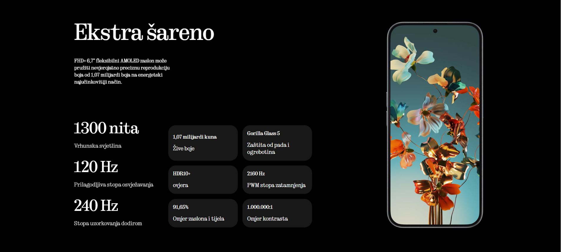 | Zaslon | Fleksibilni 6,7” AMOLED Corning Gorilla Glass 5 1084 x 2412 (395 ppi) 10-bitna (1,07 milijardi boja) dubina boje Omjer kontrasta: 1.000.000:1 Prilagodljiva brzina osvježavanja od 120 Hz Brzina uzorkovanja dodirom od 240 Hz 2160 / 1920 Hz PWM frekvencija 1300 nita vršne svjetline 1100 nita vanjske svjetline  |