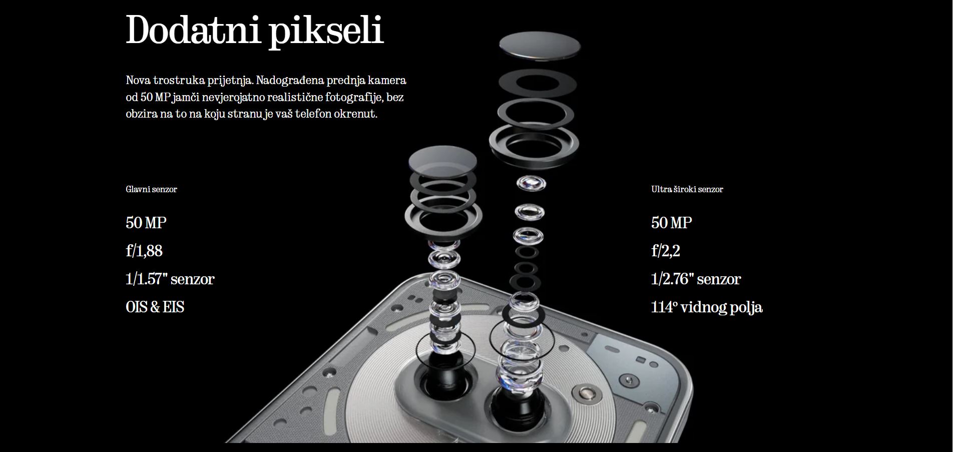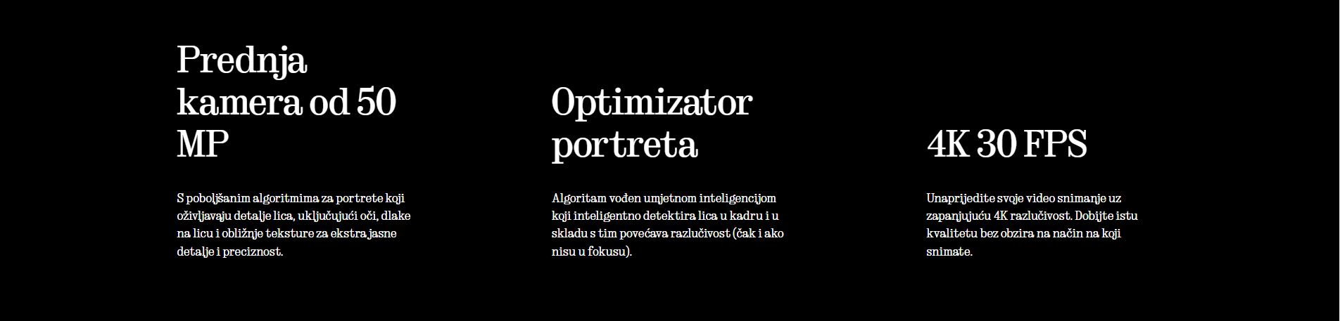 | Kamera | 50 MP, f/1.9, 24 mm širokokutna, 1/1.57", 1.0µm, PDAF, OIS 50 MP, f/2.2, 114˚ ultraširokokutna Prednja kamera 50 MP  |