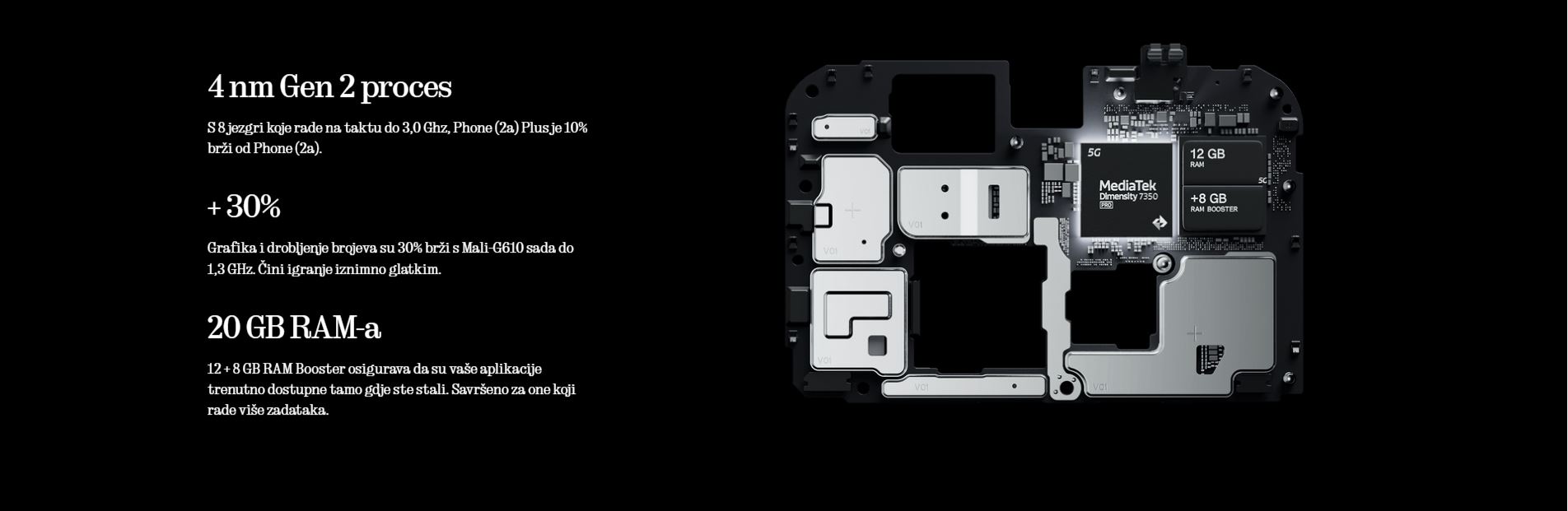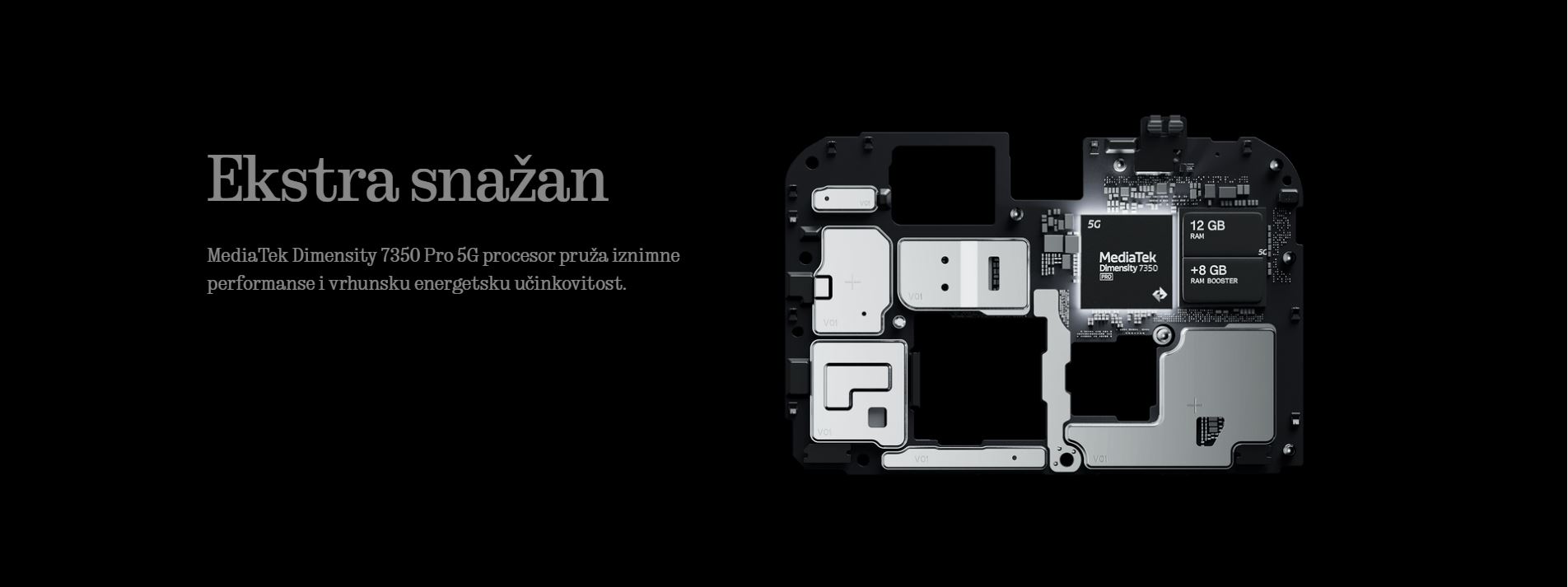 | Procesor | MediaTek Dimensity 7350 Pro 5G 4 nm Gen 2 TSMC proces (N4) 8-jezgri, do 3,0 GHz 2 jezgre performansi na 3,0 GHz (Cortex-A715) 6 učinkovitih jezgri na 2,0 GHz (Cortex-A510) GPU ARM Mali-G610 MC4  |