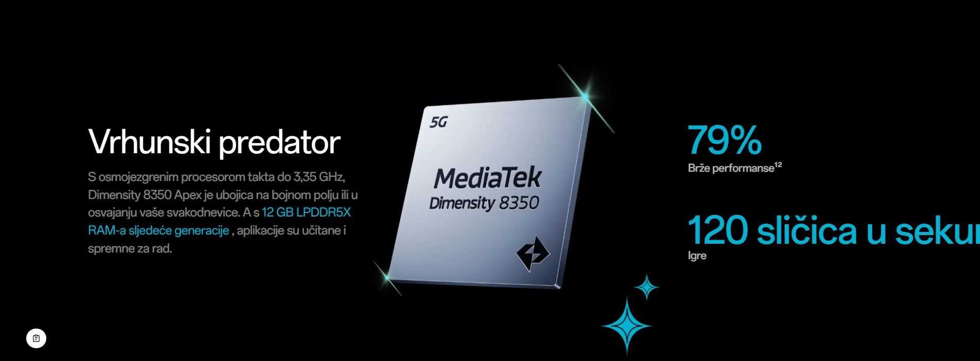 | Platforma | MediaTek Dimensity 8350 Apex Procesor: Arm cortex [email protected] Arm cortex [email protected] Arm cortex [email protected] Grafički procesor Arm G615 MC6  |