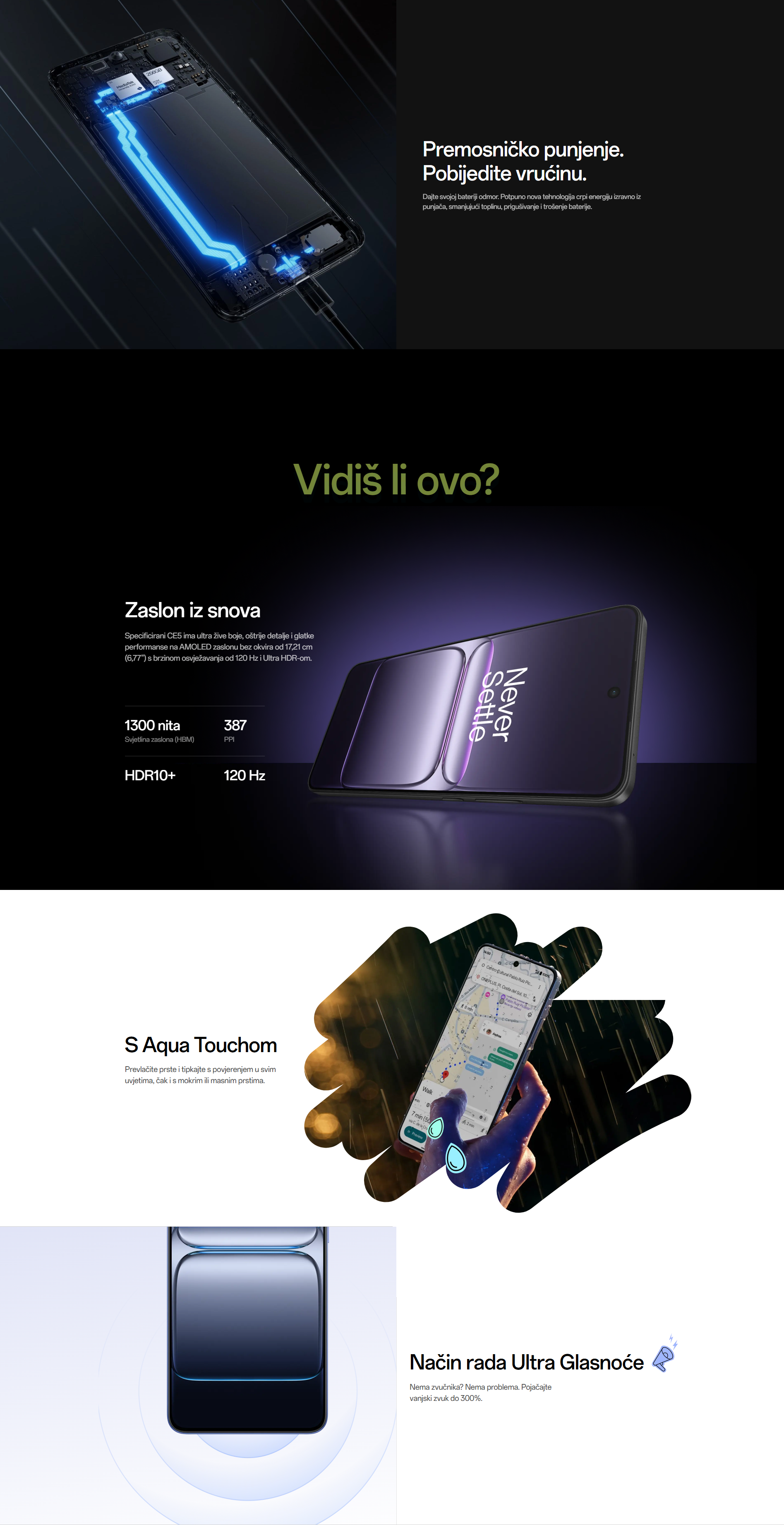 | Zaslon |  6,77" Rezolucija 2392×1080, 387 PPI Omjer zaslona i tijela 94,10% Omjer slike 19,9:9 HBM:1300 nita Vršna svjetlina1430 nita Tipična svjetlina:800 nita Brzina osvježavanja 120 Hz Brzina odziva na dodir Do 300Hz (OTA podrška), zadano 120Hz  |