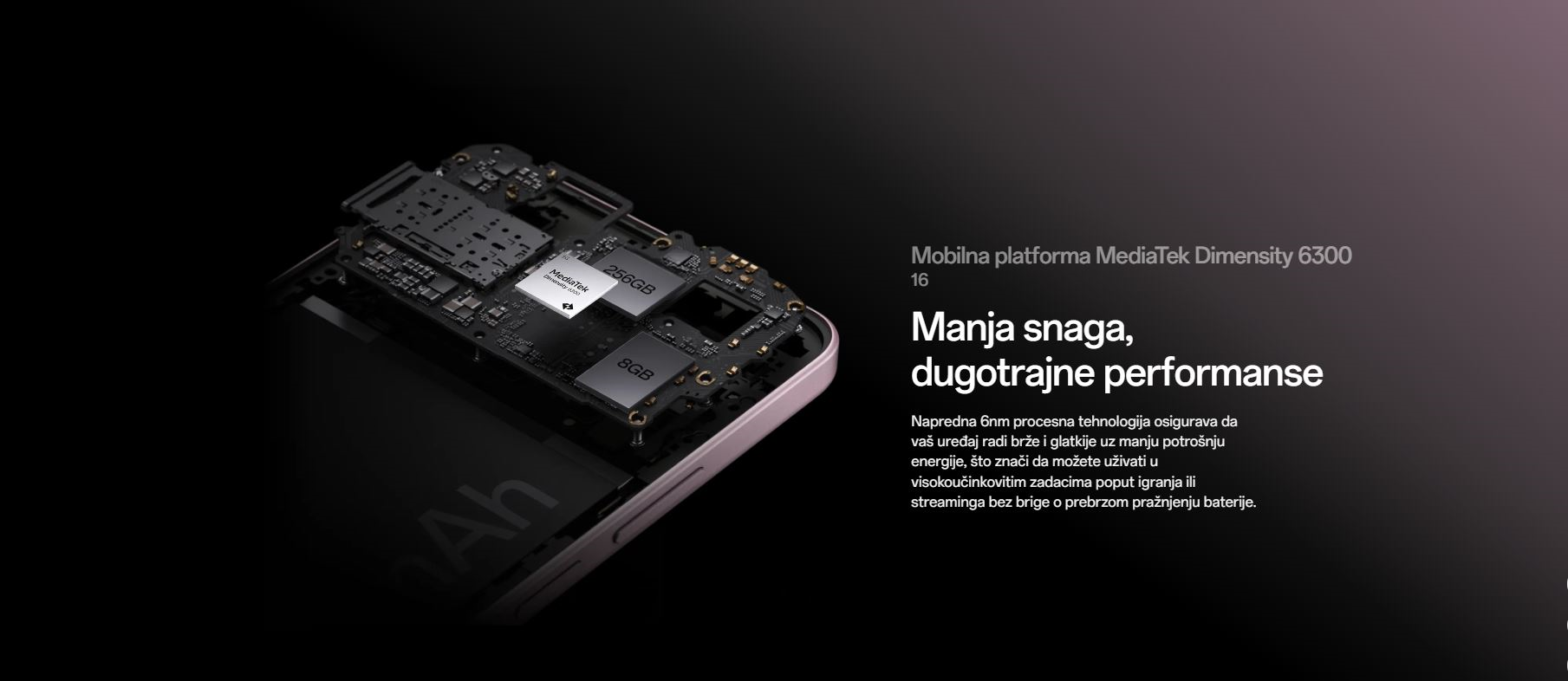 Procesor | MediaTek Dimensity 6300 Procesor8 jezgri Grafički procesorARM Mali-G57 |