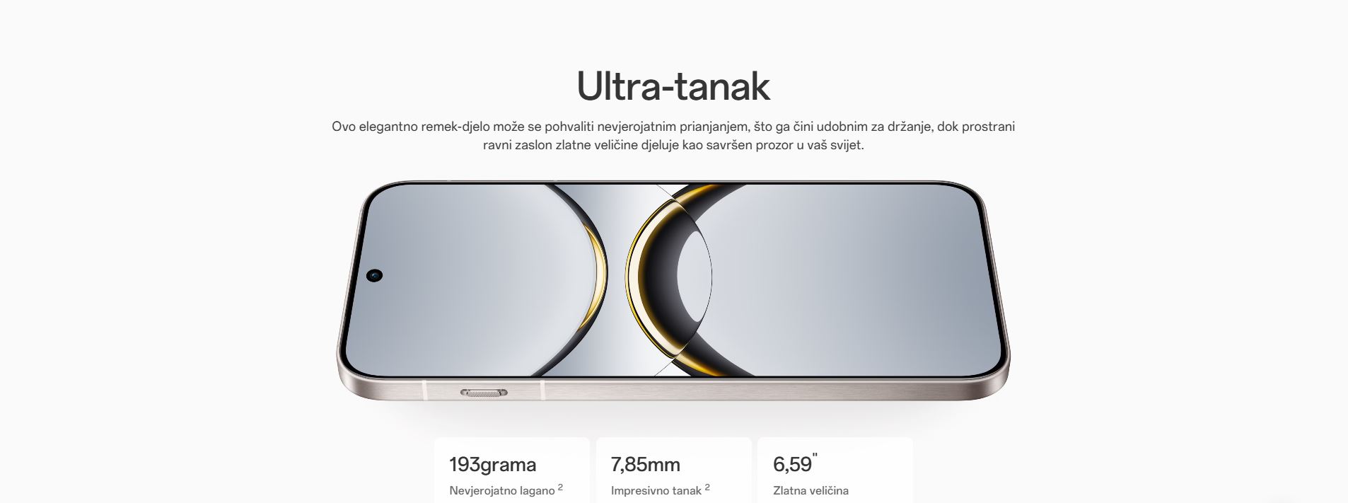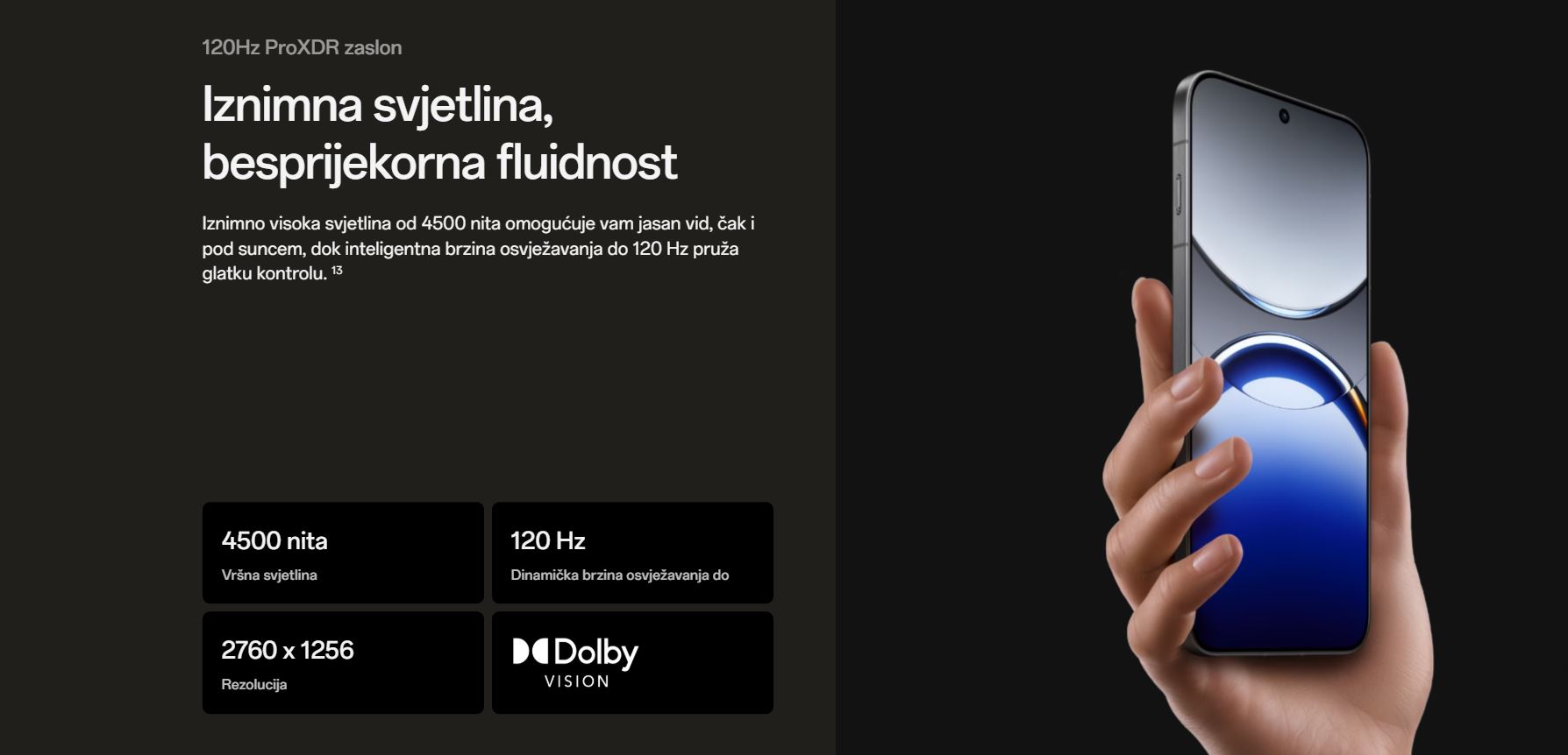 | Zaslon | 6,59" Rezolucija FHD+ (2760 × 1256 piksela) Brzina osvježavanja Maksimalno 120 Hz Brzina uzorkovanja dodira Maksimalno: 240 Hz Gustoća piksela460 PPI Svjetlina Normalna svjetlina: 800 nita (tipično), HBM: 1600 nita (tipično), Vršna svjetlina: 4500 nita (tipično, 1% APL) AMOLED Corning Gorilla Glass 7i  |