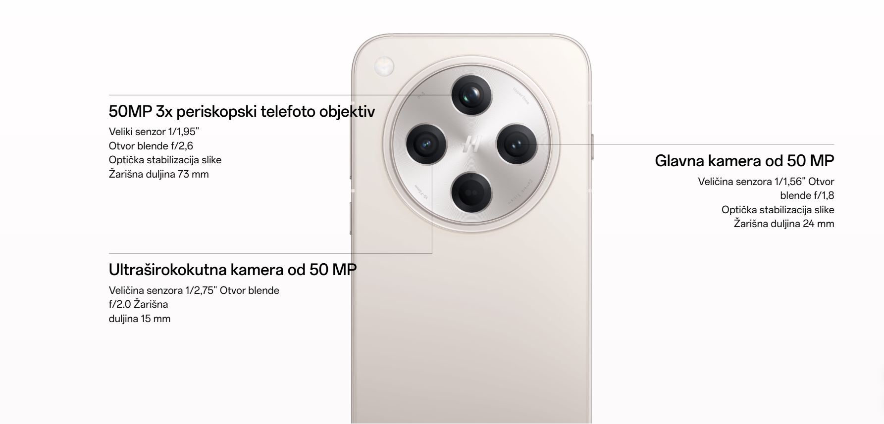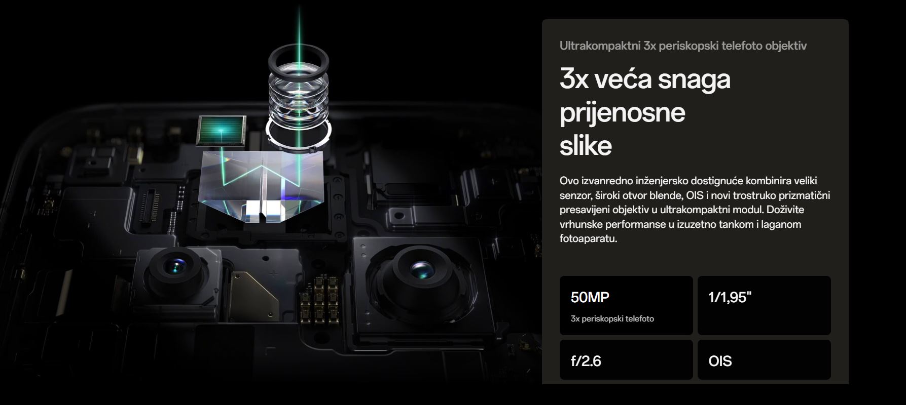 | Kamera | 50 MP Ultraširokokutna kamera50 MP Širokokutna kamera50 MP Telefoto kamera32 MP Prednja kamera |