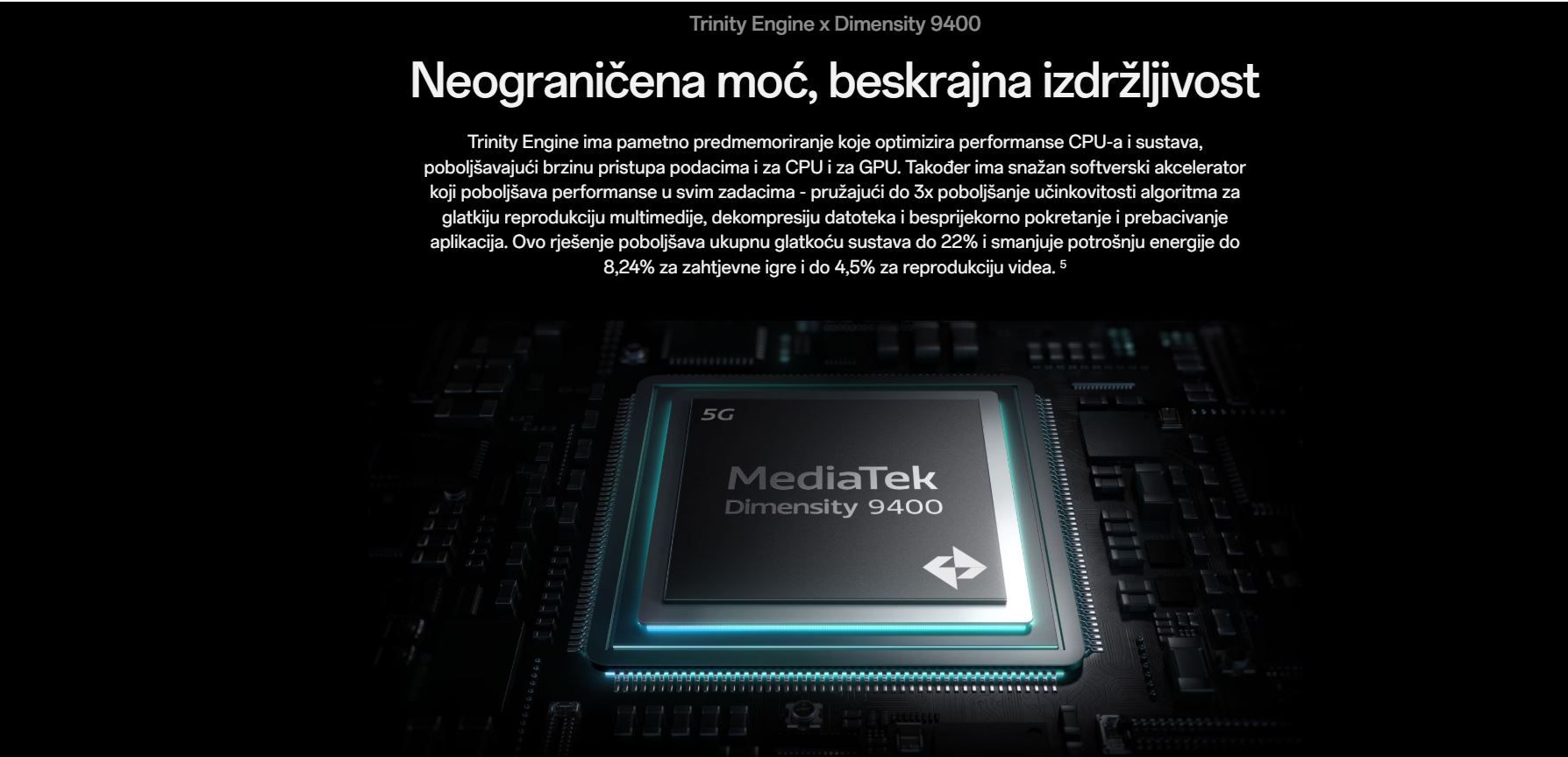 | Procesor | Mediatek Dimensity 9400 (3 nm) Procesor Osmojezgreni (1x3,63 GHz Cortex-X925 i 3x3,3 GHz Cortex-X4 i 4x2,4 GHz Cortex-A720) Grafički procesor Immortalis-G925  |