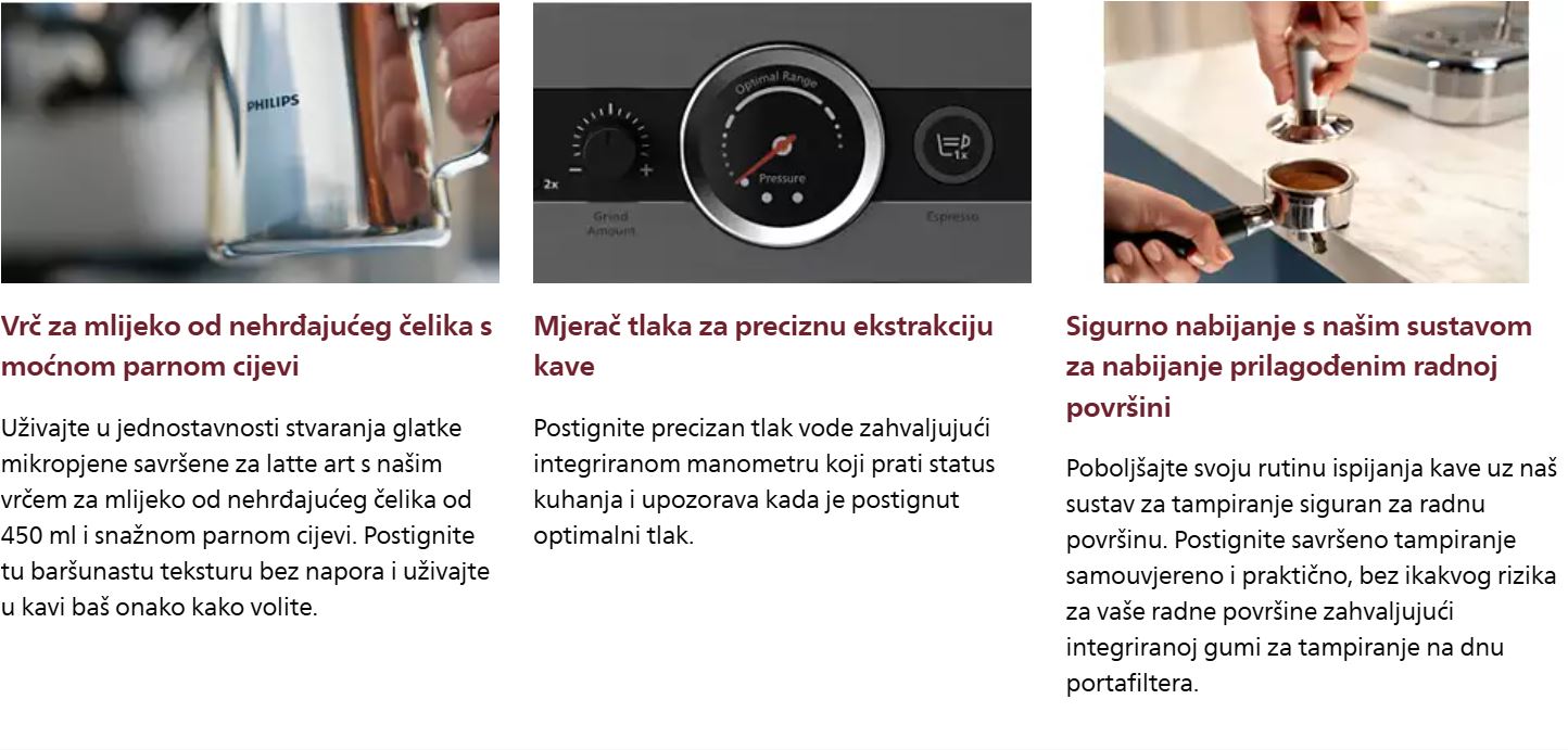 | Priložena oprema | Portafilter 4x košare za filtere Vrč za mlijeko Prsten za prah Stalak za espresso Četke i igle za čišćenje |