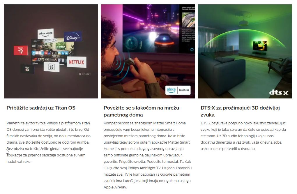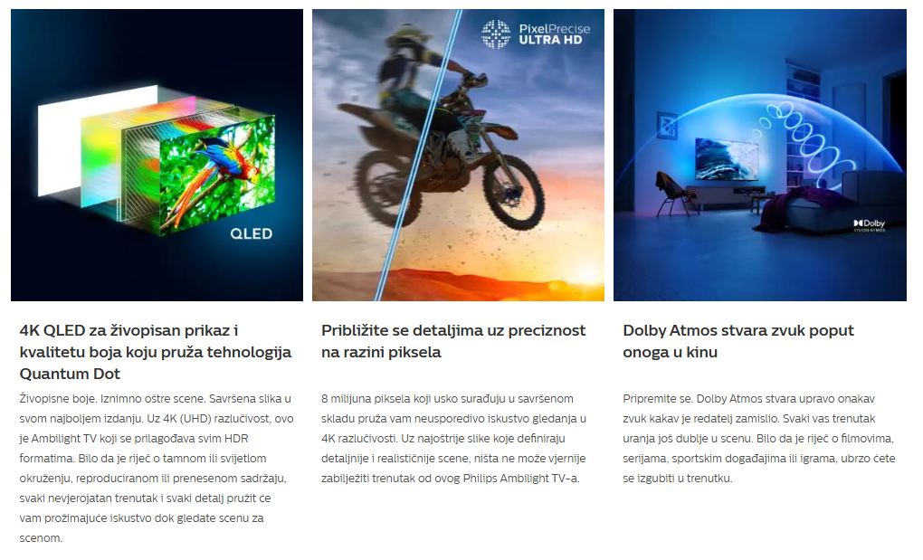 | Napredne značajke slike | Crystal Clear ECO Igra Kompatibilnost s HDR10+ Kućno kino Monitor Filmovi Micro Dimming Ultra Resolution |