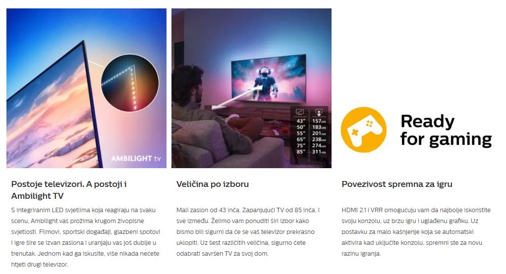 | Ambilight značajke | Ambisleep Animacija Ambilight FTI Ambilight Music Način rada za igranje Način rada s lounge svjetlom Alarm izlaska sunca Mogućnost prilagodbe boji zida |