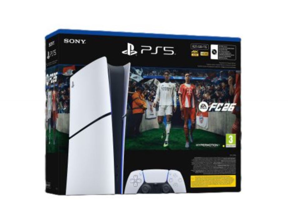 | Uključeno | Konzola PlayStation5 Slim Digital Edition (model CFI-2100 – SLIM) Ugrađeni SSD kapaciteta 825GB Bežični kontroler DualSense Igra FC26 (u obliku vaučera s kodom) HDMI kabel Napojni kabel USB kabel |
