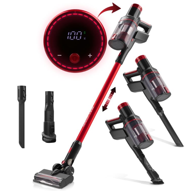LED zaslon prikazuje trenutnu razinu snage, status baterije i poruke o održavanju. Jednim klikom prelazite s podnog na ručni usisavač – prikladno za namještaj, autosjedalice ili police za knjige. Iznimno duga mlaznica za uske prostore i kombinirana mlaznica za tapecirani namještaj/četku pružaju vam više mogućnosti čišćenja.
