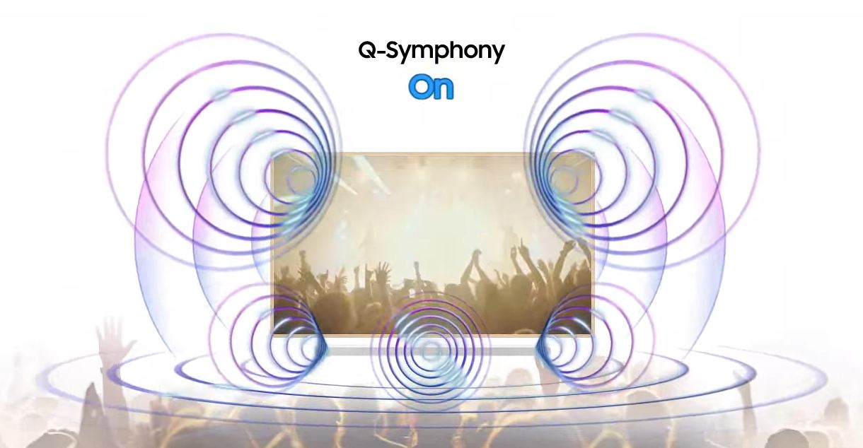Q-Symphony je ekskluzivna Samsungova tehnologija koja omogućuje istovremenu reprodukciju s TV zvučnika i soundbara, što rezultira impresivnom sinergijom zvuka. Trenutna verzija Q-Symphony nudi optimiziran zvuk za sve kanale. Pokreće je AI tehnologija koja remasterira dolazni zvuk.