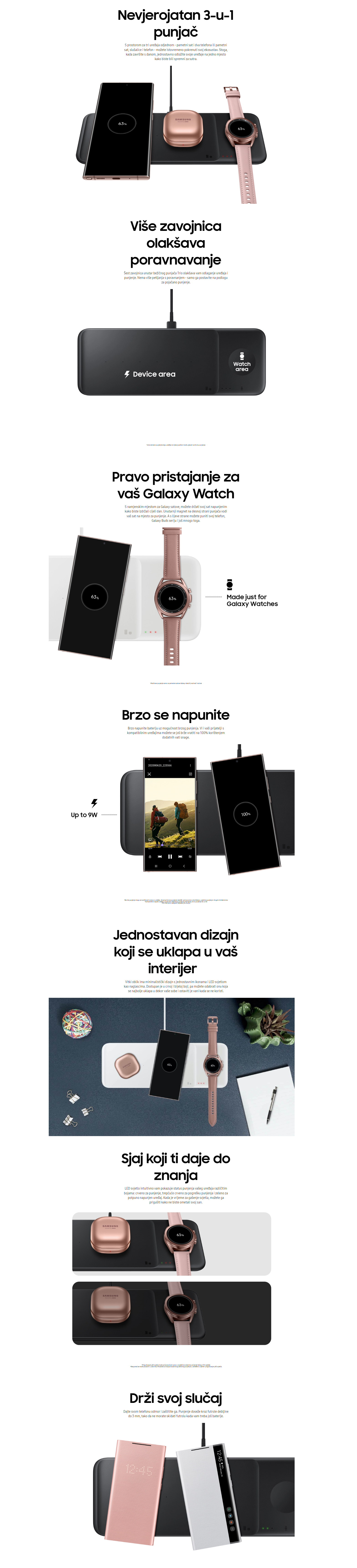 | Kompatibilni modeli | Brzo punjenje kompatibilno s Galaxy Note20, Note20 ultra, S20, S20+, S20 ultra, Z Fold2, Z Flip, Note 10+, Note 10, S10e, S10, S10+, S10 5G, Note9, S9, S9+, Note8, S8, S8+, S7, S7 Edge, Note 5, S6 Edge+ i Apple iPhone 11 pro, 11, SE, XS Max, XS, XR, 8, 8 Plus / Qi kompatibilno s Galaxy S6, S6 Edge i Qi certificiranim uređajima (Galaxy Buds live, Buds+) / Galaxy Watch3, Watch Active2, Watch Active |