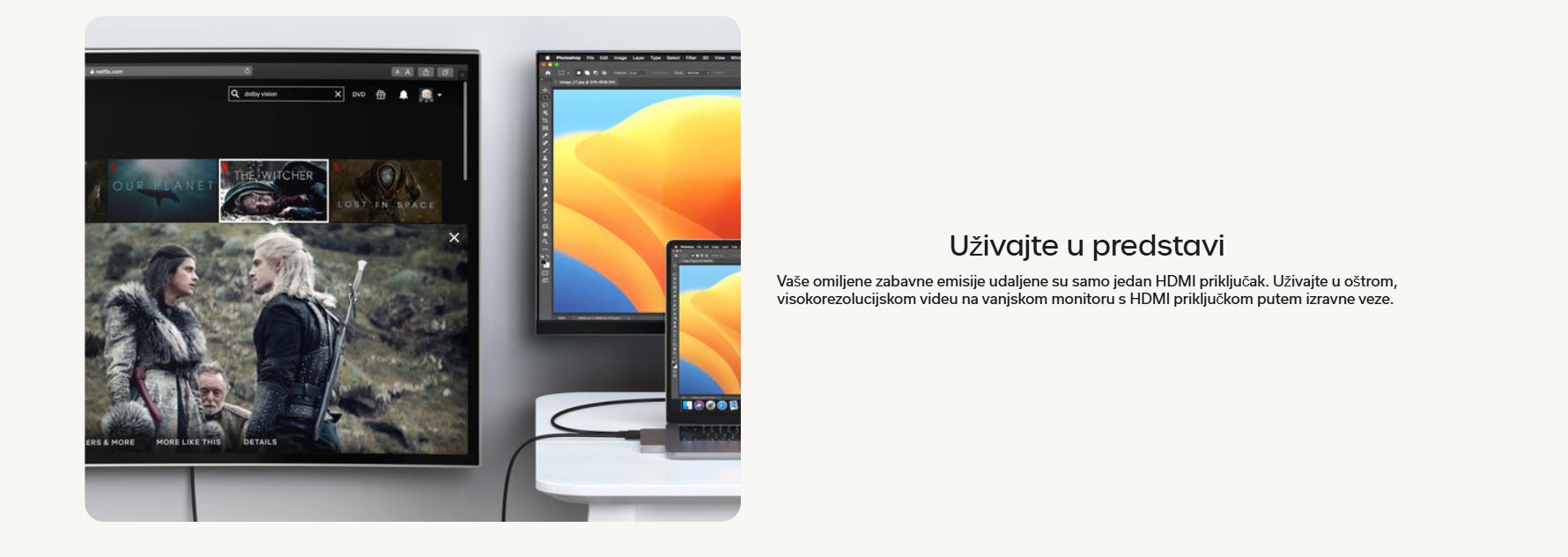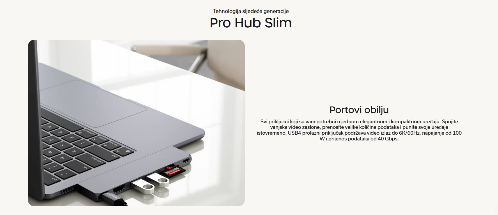 1 x USB4 - punjenje do 100 W, izlaz zaslona do 6K 60 Hz, prijenos podataka do 40 Gbps 1 x HDMI priključak - do 4K 60 Hz. Podržava HDCP1.4/2.3 i HDR2 x USB-A podatkovni priključci - brzine prijenosa podataka do 10 Gbps, maksimalno 900 mA po priključku Utori za SD/MicroSD kartice - podržavaju brzine prijenosa podataka UHS-I (do 104 MB/s), SD/SDHC/SDXC, do 2 TB. Obje kartice se mogu čitati istovremeno 1 x USB-C podatkovni priključak - brzine prijenosa podataka do 10 Gbps. Ne podržava prolazno punjenje ili video izlaz.