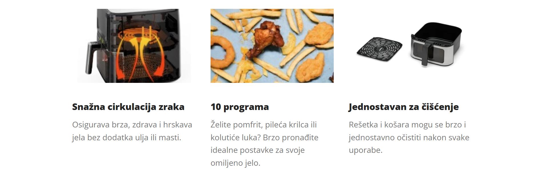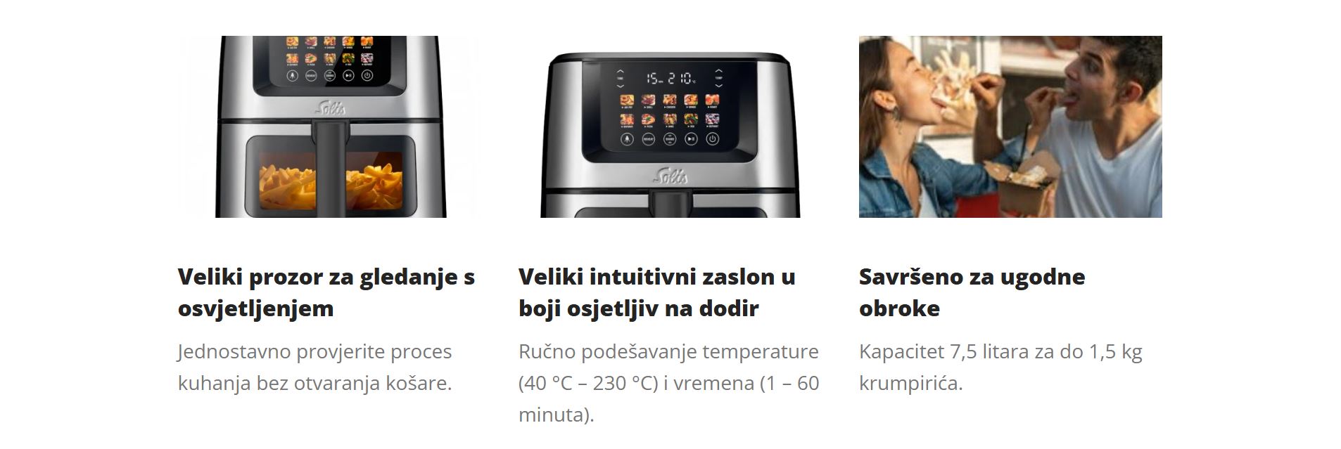 | Ostale značajke |  3D cirkulacija zraka	     Unutarnje svjetlo Zaslon na dodir u boji Neljepljivi premaz košare Tehnologija vrućeg zraka Automatsko gašenje Funkcija podsjetnika trešnjom Funkcija podgrijavanja Ušteda energije Zaštita od pregrijavanja  |