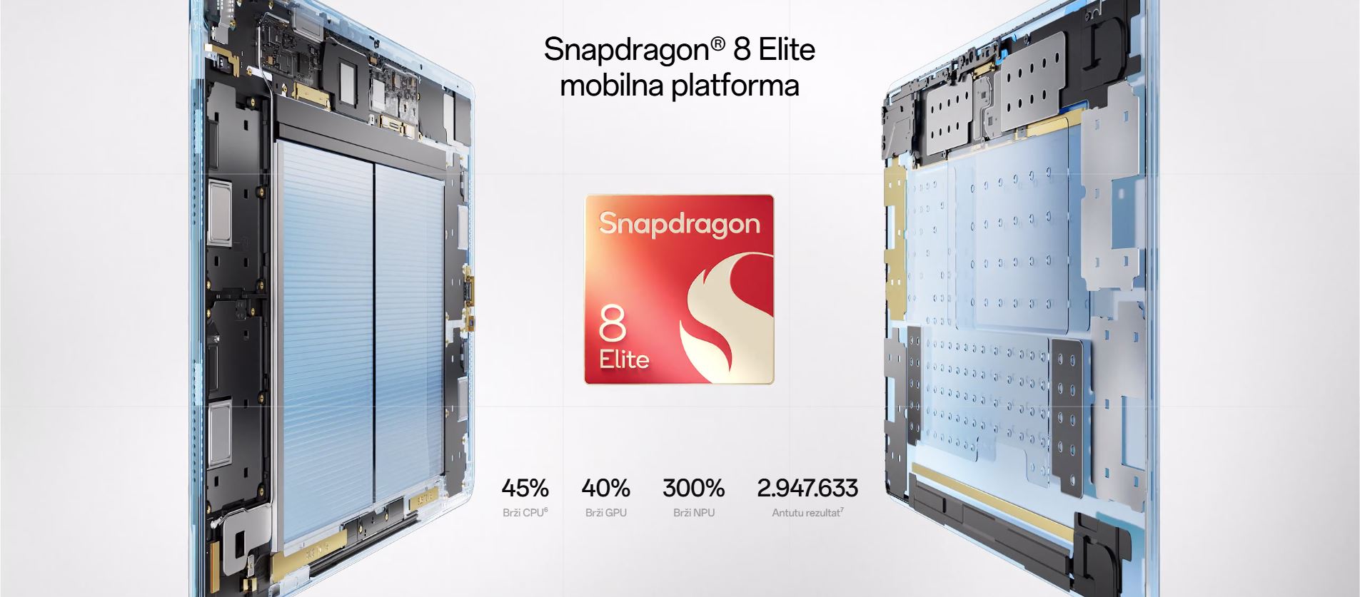 | Performanse | Čipset Snapdragon 8 Elite mobilna platforma Grafički procesorAdreno 830 @ do 1,1 GHz ProcesorQualcomm Oryon CPU @ do 4,32 GHz |