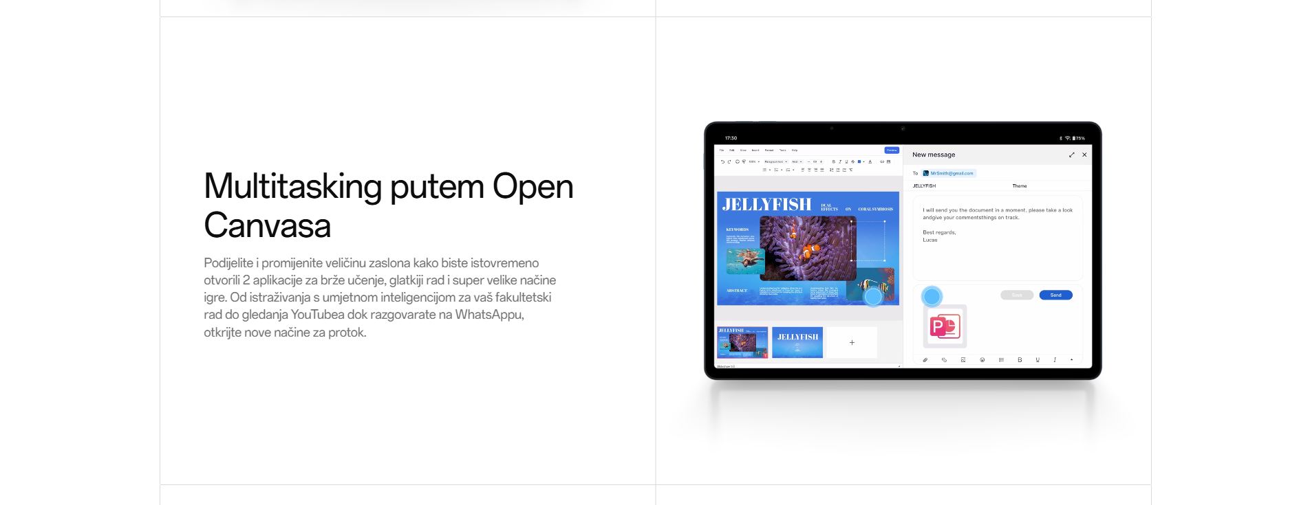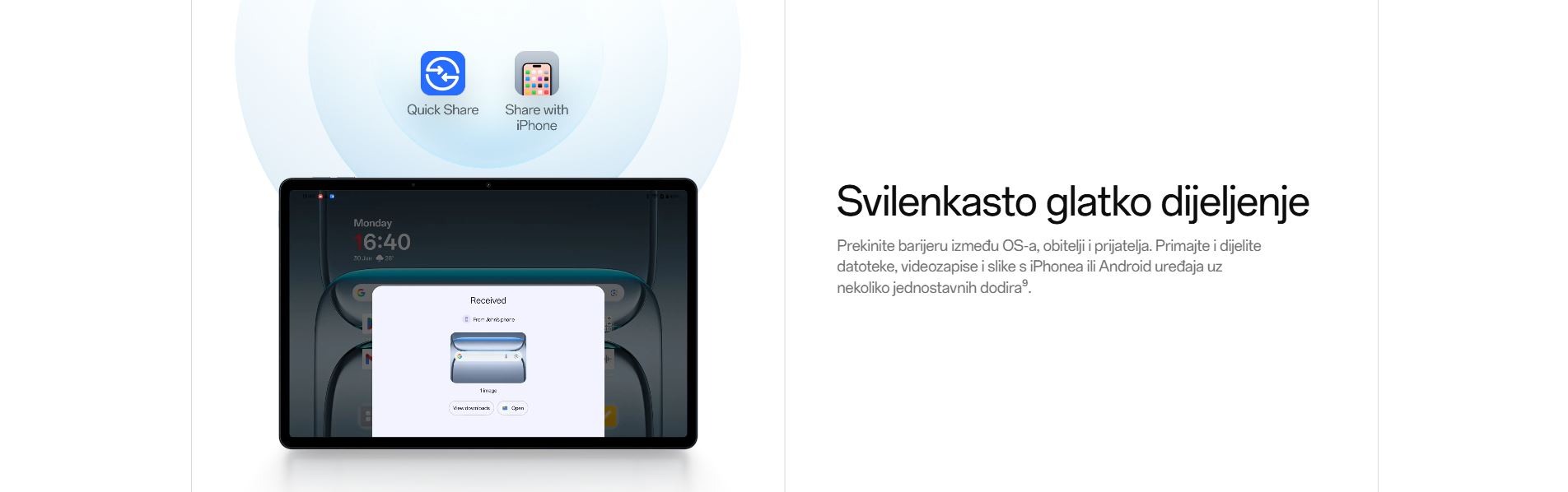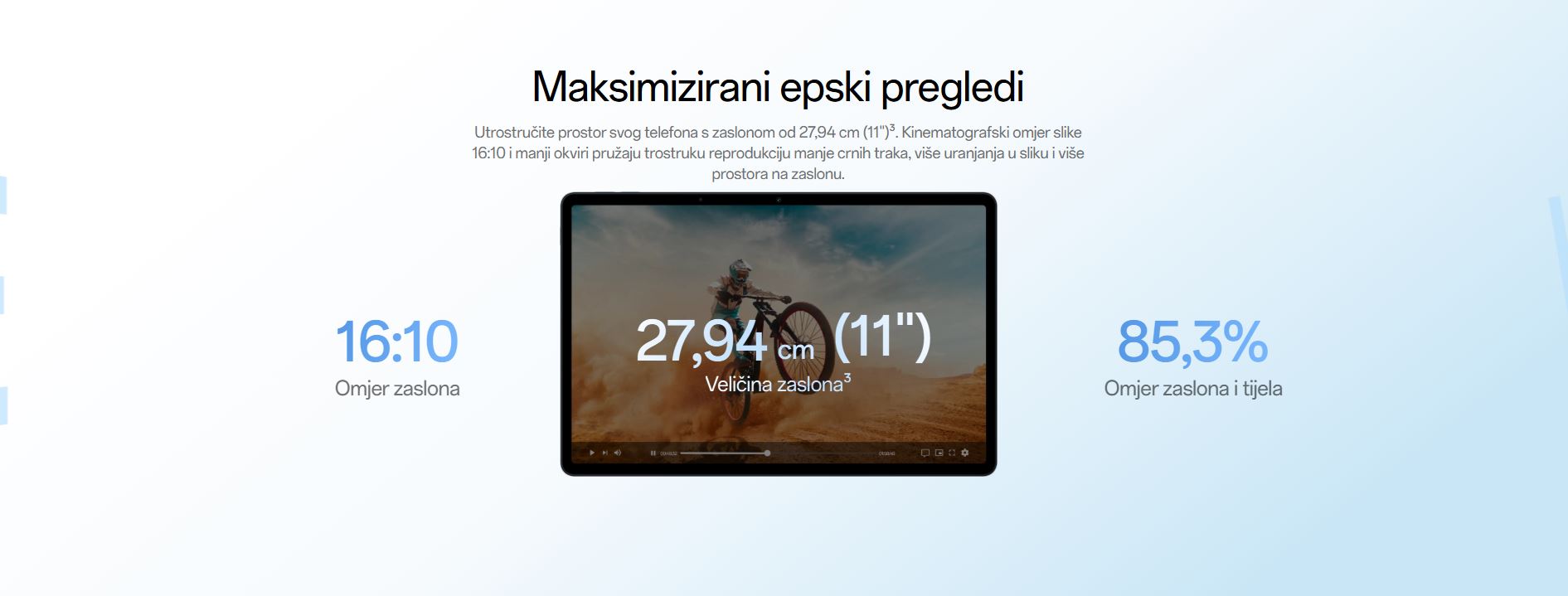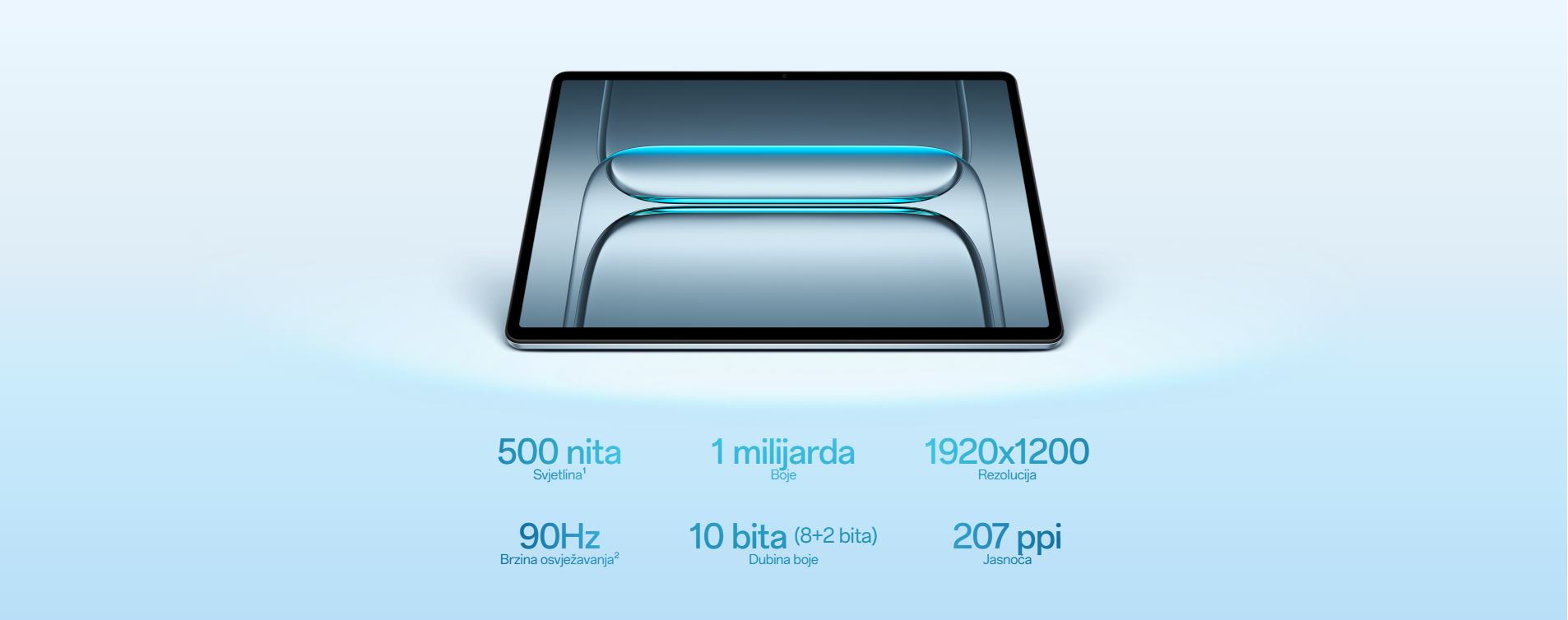 | Zaslon | LCD zaslon veličina zaslona 11" Rezolucija 1920 x 1200 Gustoća piksela 207 PPI Brzina osvježavanja maks. 90Hz Brzina uzorkovanja dodira 180Hz Svjetlina 500 nita |