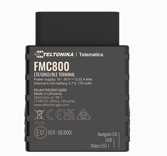 | Prijenos podataka | LTE: LTE FDD: maks. 10 Mbps (DL)/maks. 5 Mbps (UL); GSM: GPRS: Maks. 85,6 Kbps (DL)/Maks. 85,6 Kbps (UL); SMS (tekst/podaci); Raspon ulaznog napona; 10–30 V DC sa zaštitom od prenapona i obrnutog polariteta; Litij-ionska baterija od 170 mAh, 3,7 V (0,63 Wh); Unutarnji osigurač 3A, 125V; Bluetooth; 4,0 + LE; Senzor temperature i vlažnosti, Inateck skener barkodova, podrška za univerzalne BLE senzore; OBDII utičnica; GNSS antena; Interni visoki pojačanje; Mobilna antena; Interni GSM s visokim pojačanjem; 2.0 Micro-USB; 2 statusne LED lampice; Mikro-SIM; 128 MB interne flash memorije; Dimenzije 67,2*49,6*25 mm; Težina 63 g; Radna temperatura (bez baterije); -40 °C do +85 °C; Temperatura skladištenja (bez baterije); -40 °C do +85 °C; Radna vlažnost; 5% do 95% bez kondenzacije; Ocjena zaštite od prodora; IP41; Temperatura punjenja baterije od 0 °C do +45 °C; Temperatura pražnjenja baterije -20 °C do +60 °C; Temperatura skladištenja baterije -20 °C do +35 °C tijekom 1 mjeseca; -20 °C do +30 °C tijekom 6 mjeseci; Akcelerometar; |