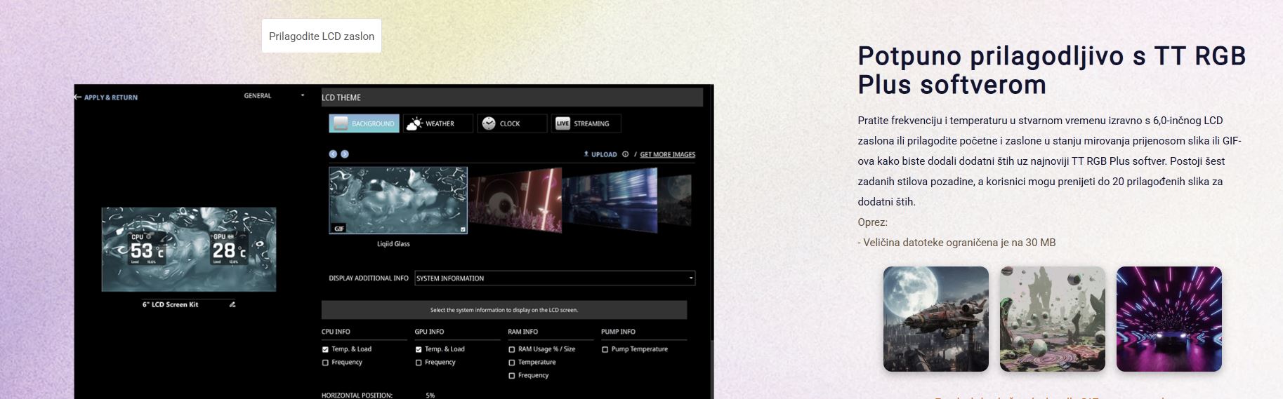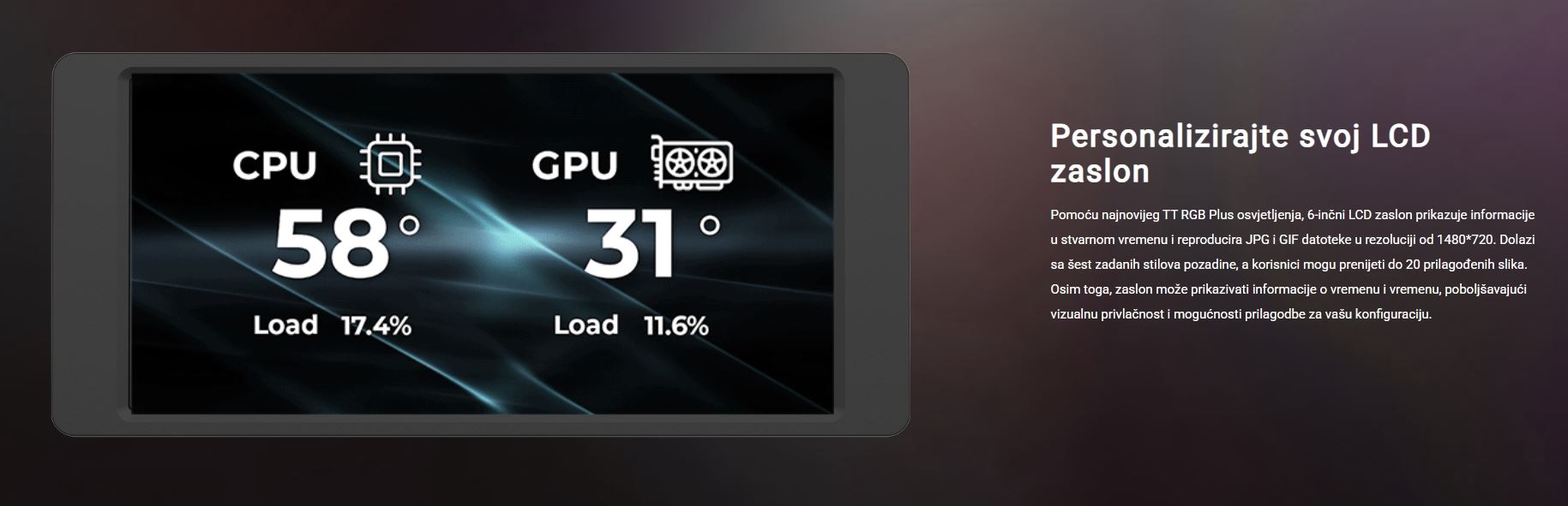 LCD zaslon jednostavan je za instalaciju i može se kontrolirati pomoću softvera TT RGB Plus. To vam omogućuje prilagođavanje zaslona vašim potrebama i prikaz važnih podataka.