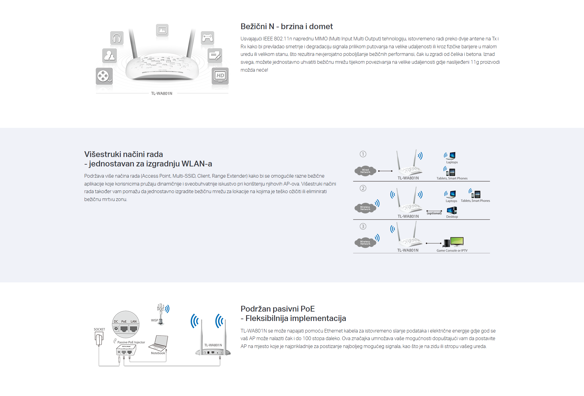 TP-Link TL-WA801N je pouzdana i svestrana bežična pristupna točka dizajnirana za proširenje mrežne povezanosti u kućnom ili poslovnom okruženju.